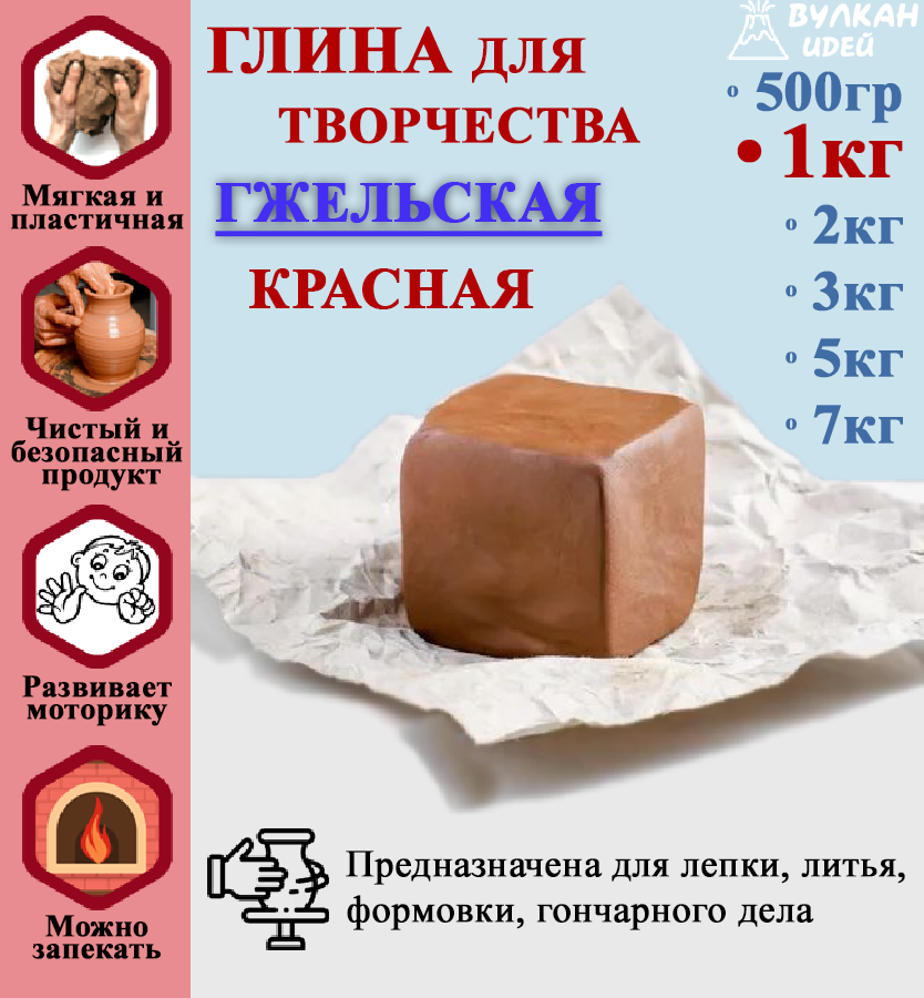 СохранитьГжельская глина для лепки. Гончарная красная, натуральная, подходит для обжига. Рукоделие и скульптурная лепка для детей. 1000 гр (1 кг) интересное: