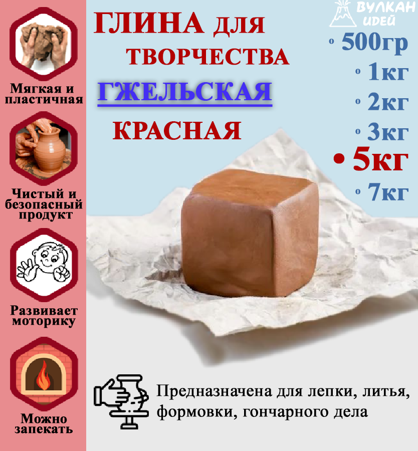СохранитьГжельская глина для лепки. Гончарная красная, натуральная, подходит для обжига. Рукоделие и скульптурная лепка для детей. 5000 гр (5 кг) интересное: