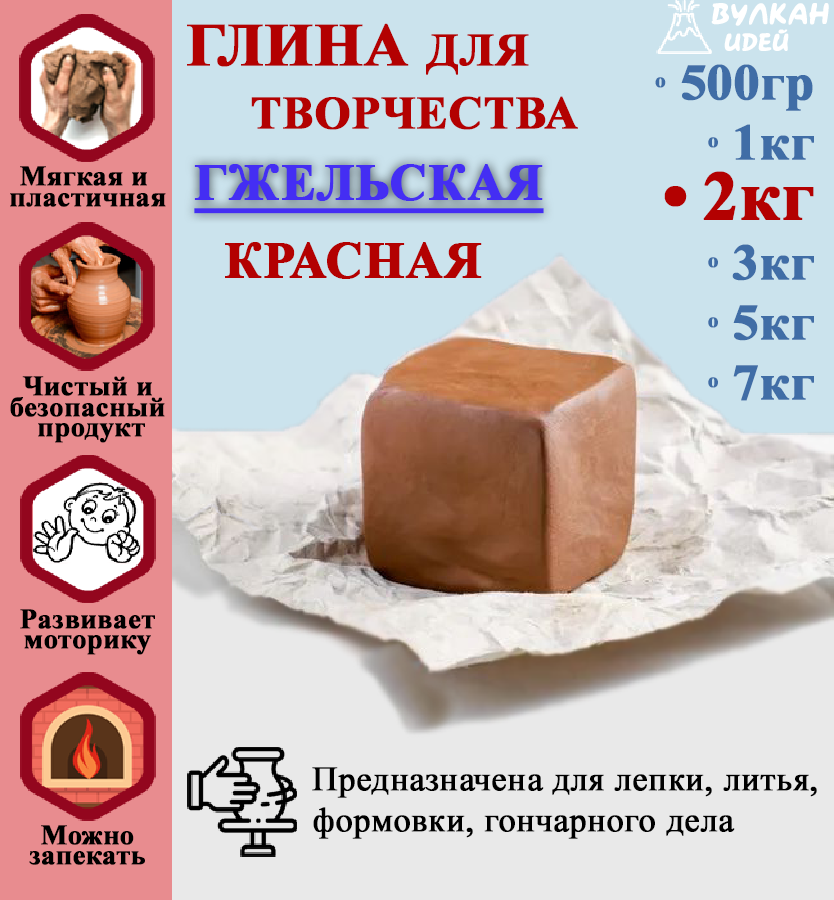 СохранитьГжельская глина для лепки. Гончарная красная, натуральная, подходит для обжига. Рукоделие и скульптурная лепка для детей. 2000 гр (2 кг) интересное: