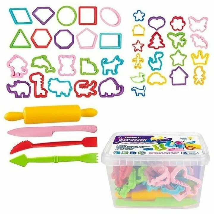 | Состав набора | 32 большие формочки "Зверята", "Предметы и "Фигуры", 6 мини-формочек, 3 стека, скалка. |