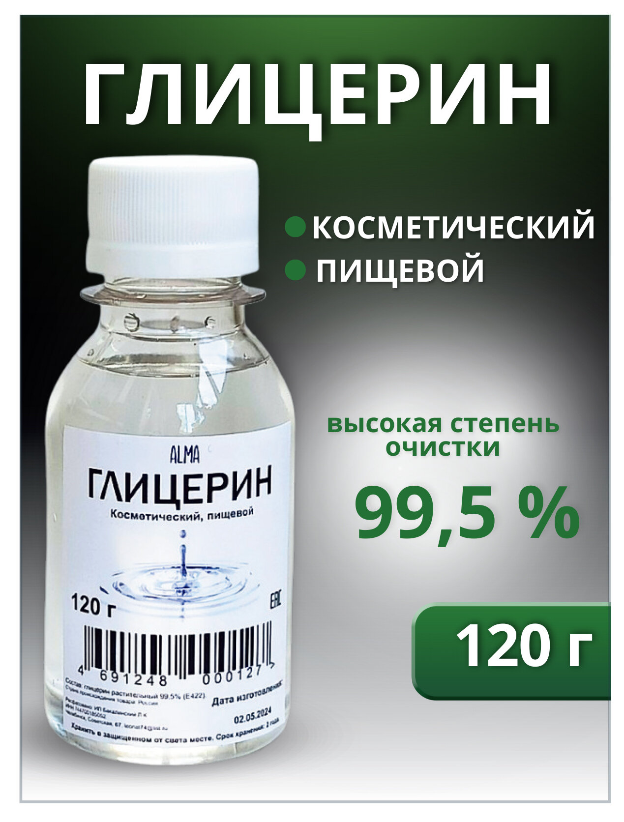 Глицерин ALMA прозрачный, жидкий, пищевой, аптечный, косметический, дистиллированый 99,5%, 120 г