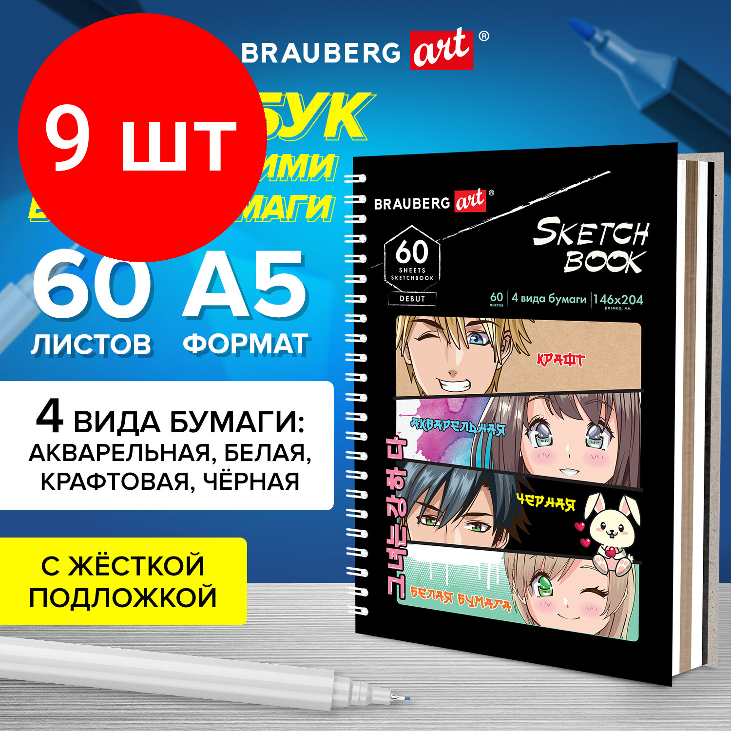 Купить Комплект 9 шт, Скетчбук, 4 вида бумаги (акварельная,белая,черная,крафт) 145х205мм, 60л, гребень, BRAUBERG ART, 115066