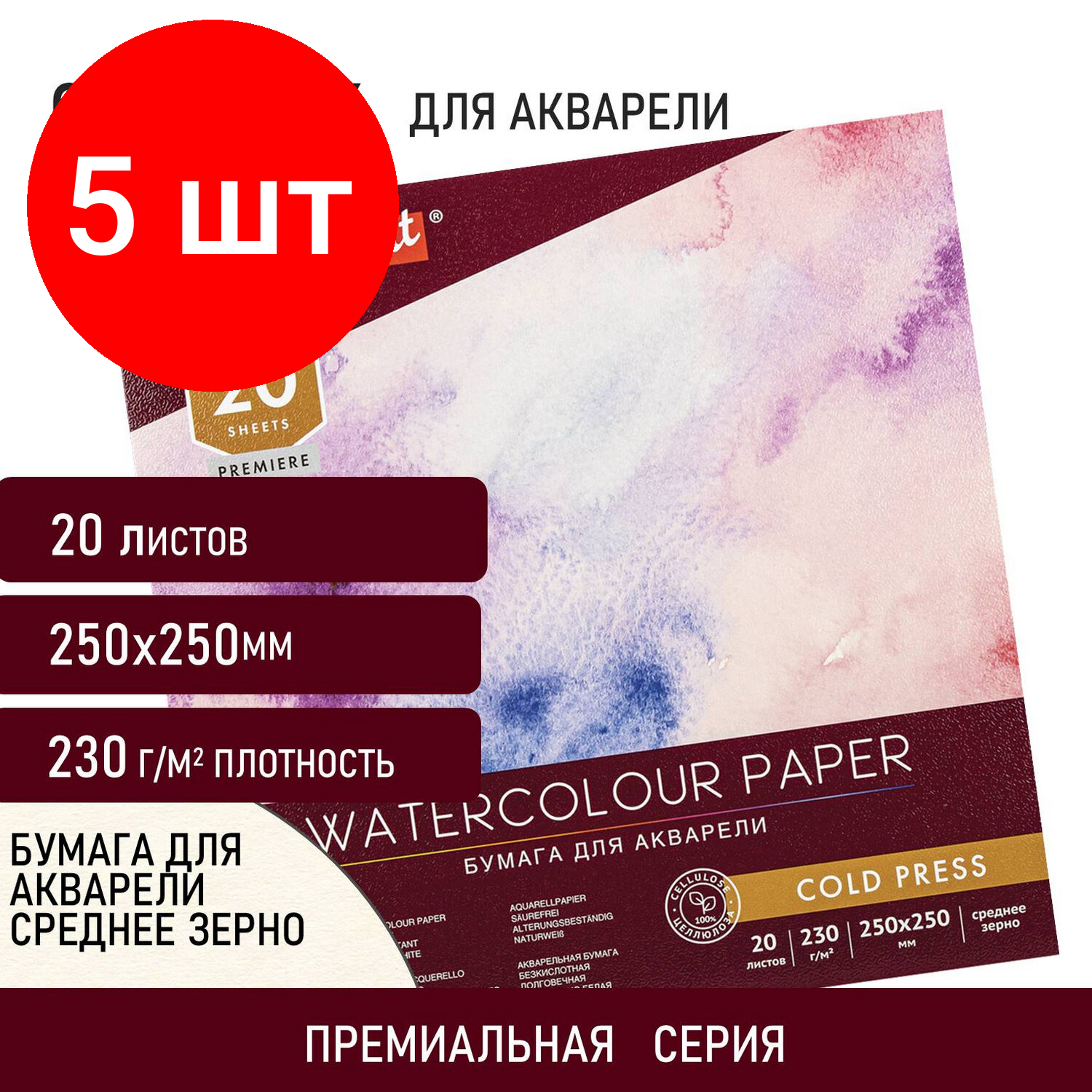 Купить Комплект 5 шт, Альбом для акварели, бумага 230 г/м2, 250х250 мм, среднее зерно, 20 листов, склейка, BRAUBERG ART "PREMIERE", 113216