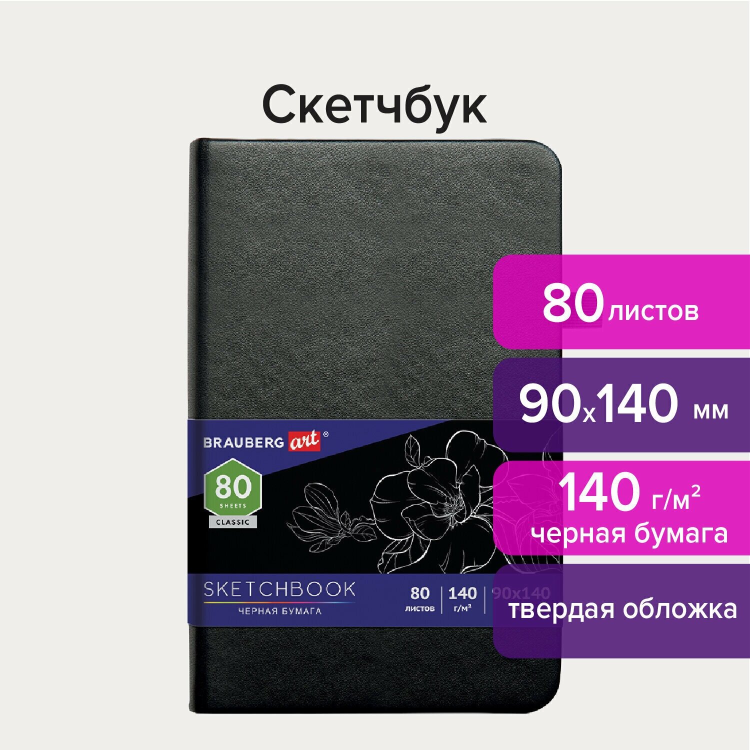 Скетчбук для эскизов Brauberg Art Classic, 80л, 9х14см, 140г/м2, черная бумага, кожзам, резинка, ляссе