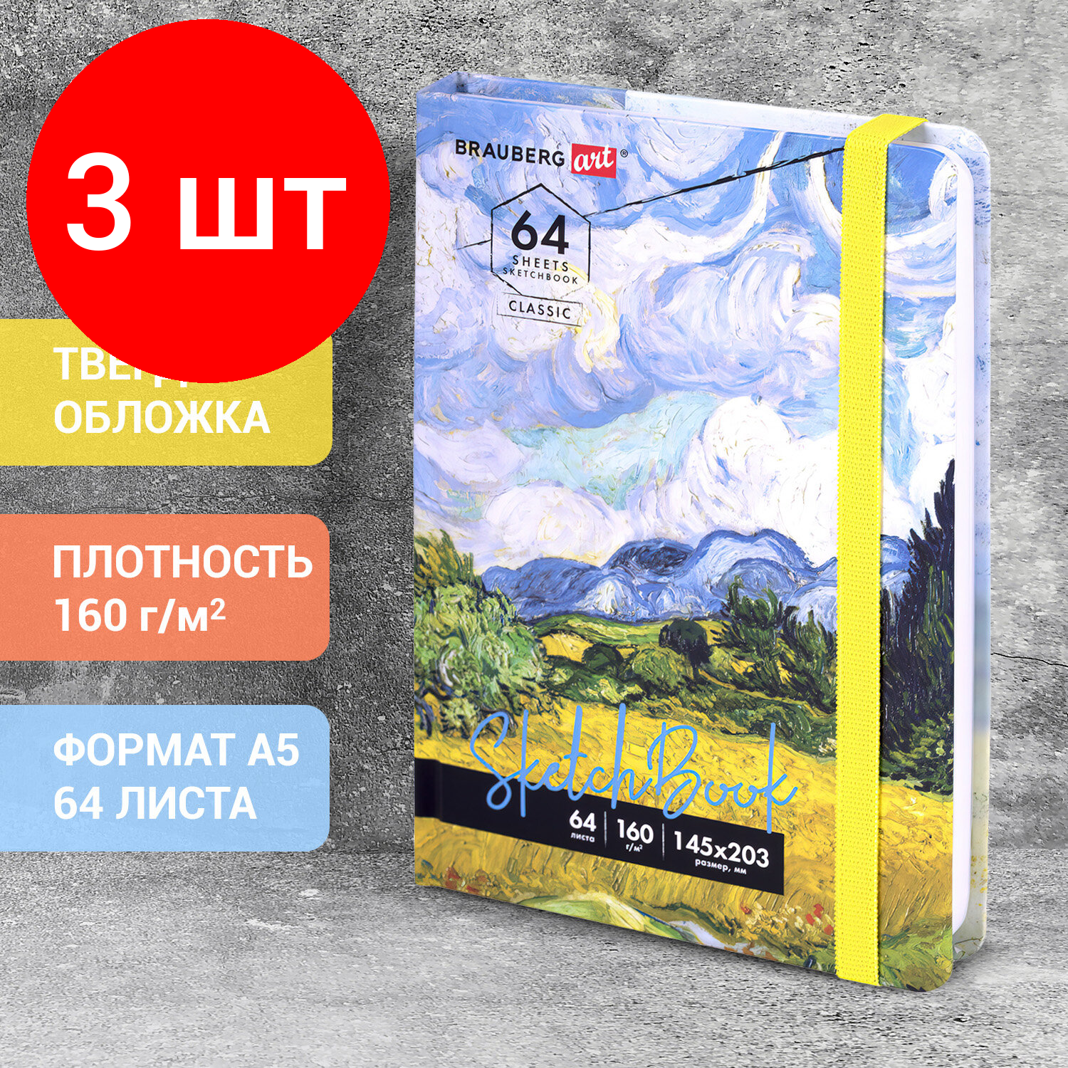 Комплект 3 шт, Скетчбук, белая бумага 160 г/м2, 145х203 мм, 64 л, резинка, твердый, BRAUBERG ART CLASSIC "Ван Гог", 114590