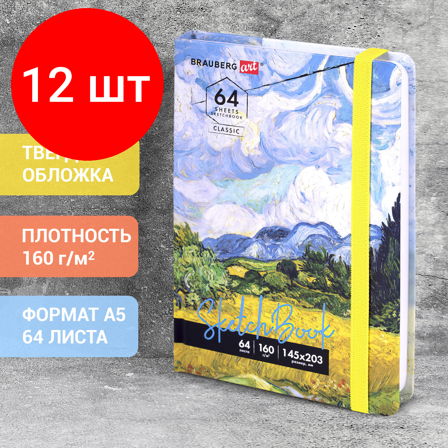 Комплект 12 шт, Скетчбук, белая бумага 160 г/м2, 145х203 мм, 64 л, резинка, твердый, BRAUBERG ART CLASSIC "Ван Гог", 114590