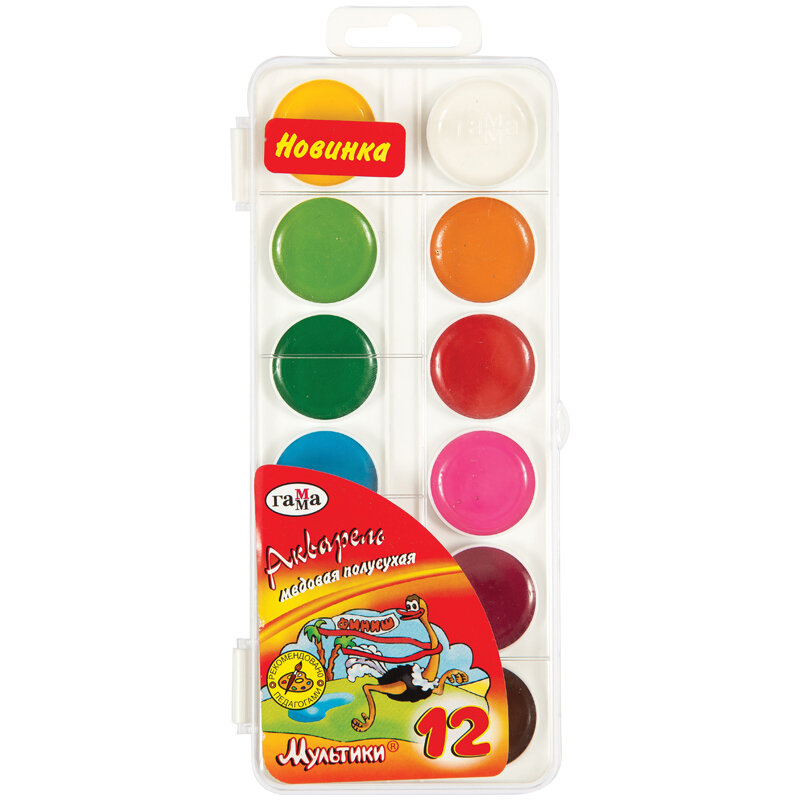 Купить Акварель 12 цветов "Гамма" "Мультики", медовая, без кисти, пластик