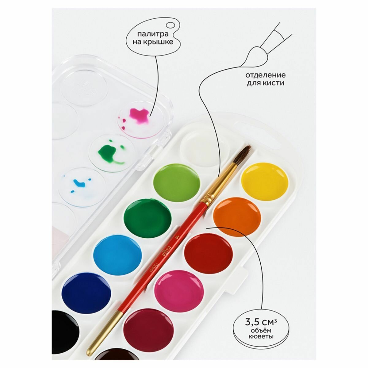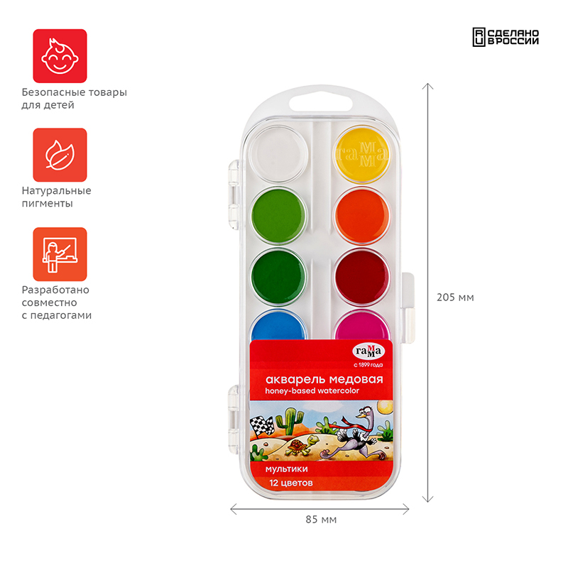 Краски акварельные медовые полусухие. Набор «Мультики». Акварель 12 цветов, без кисти. Гамма 211046_12
