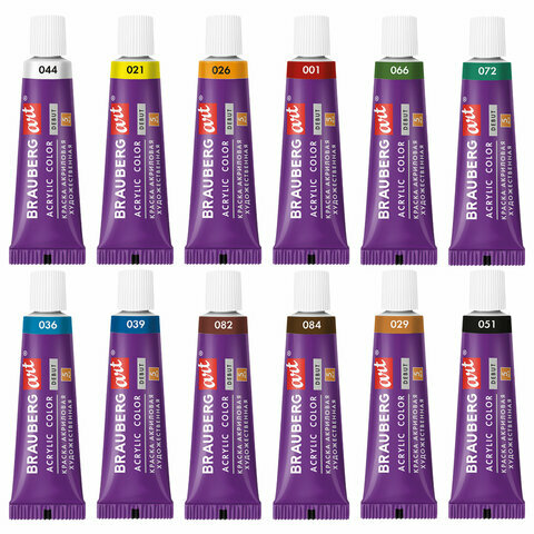 Акриловые краски набор для рисования, художественные 12 цветов по 5 мл в тюбиках, Brauberg Art Debut, 192385