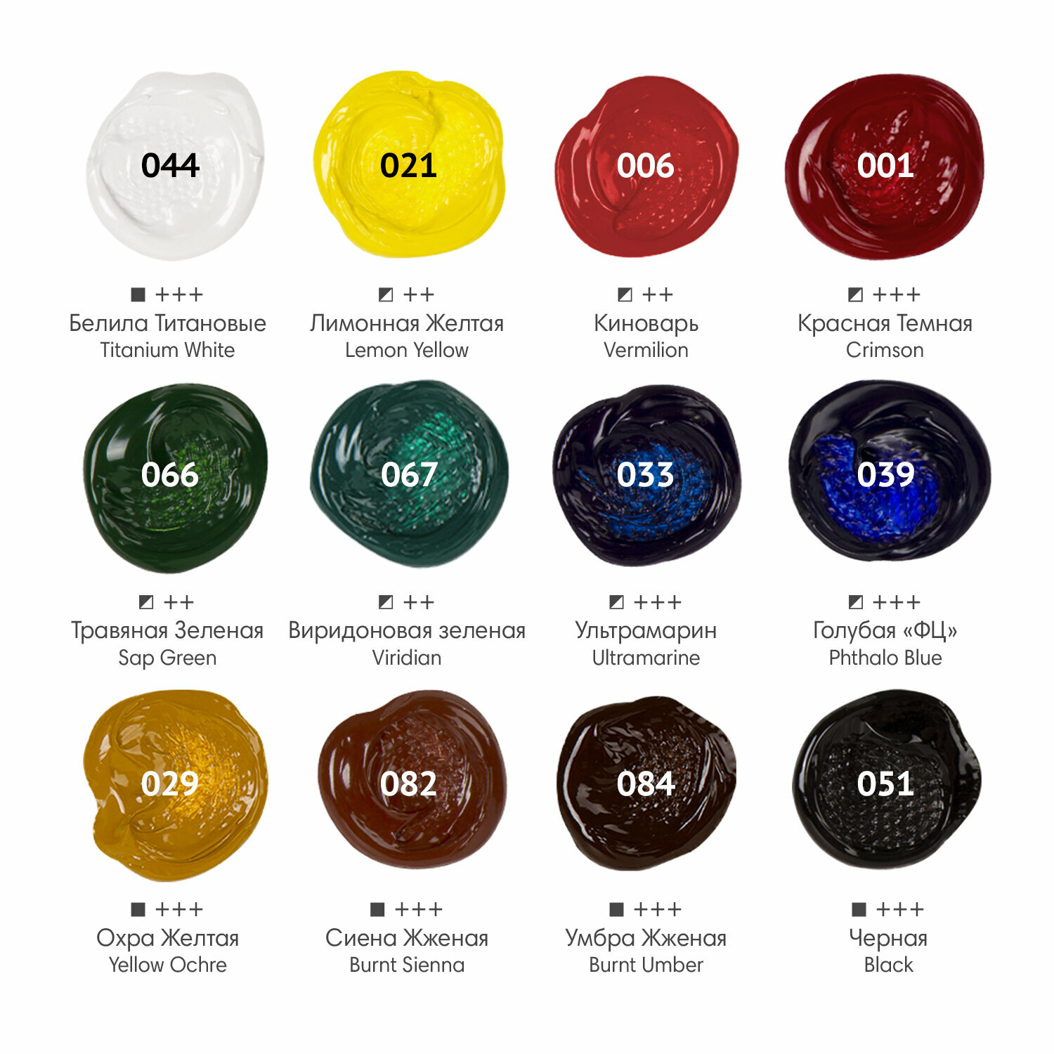 | Комплектация | в наборе 11 цветов: - белила титановые (044) - 2 шт.; - лимонная желтая (021); - оранжево-желтая (026); - красная темная (001); - церулеум (036); - голубая ФЦ (039); - зеленая светлая (062); - охра желтая (029); - сиена жженая (082); - умбра жженая (084); - черная (051) |