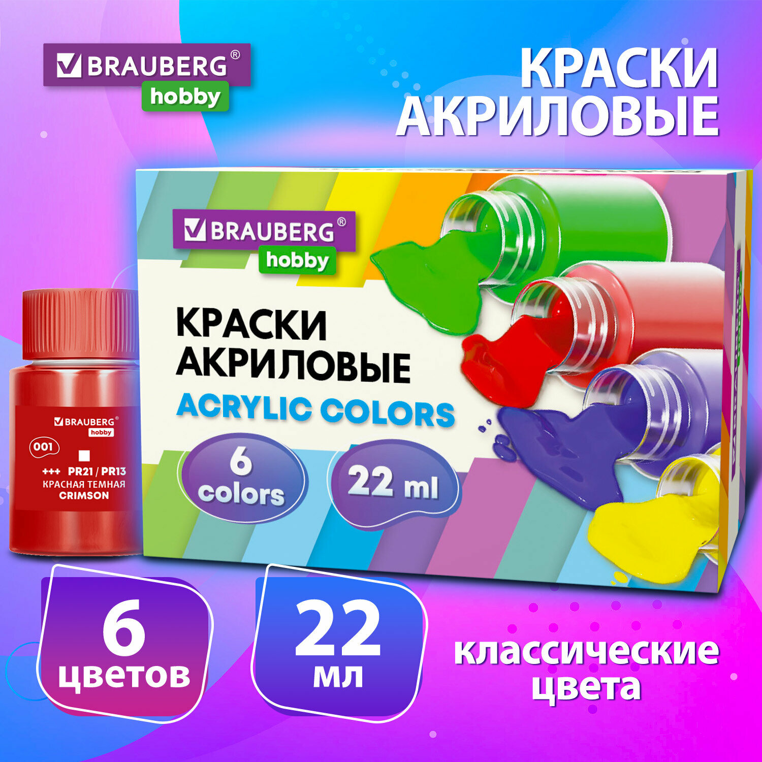 Краски акриловые художественные Brauberg ART CLASSIC, набор 24 шт, 21 цвет, в тубах 22 мл