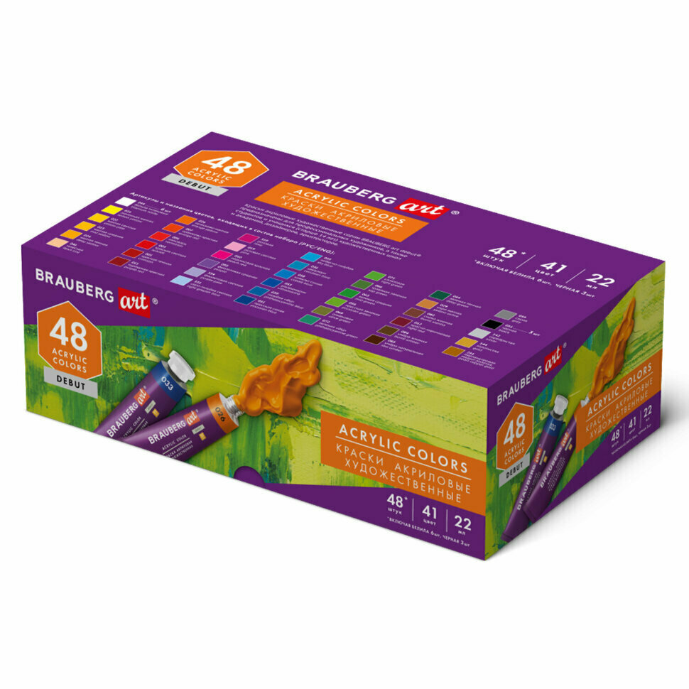 Купить Краски акриловые художественные, набор 48 штук, 41 цвет по 22 мл, в тубах, BRAUBERG ART DEBUT, 192302