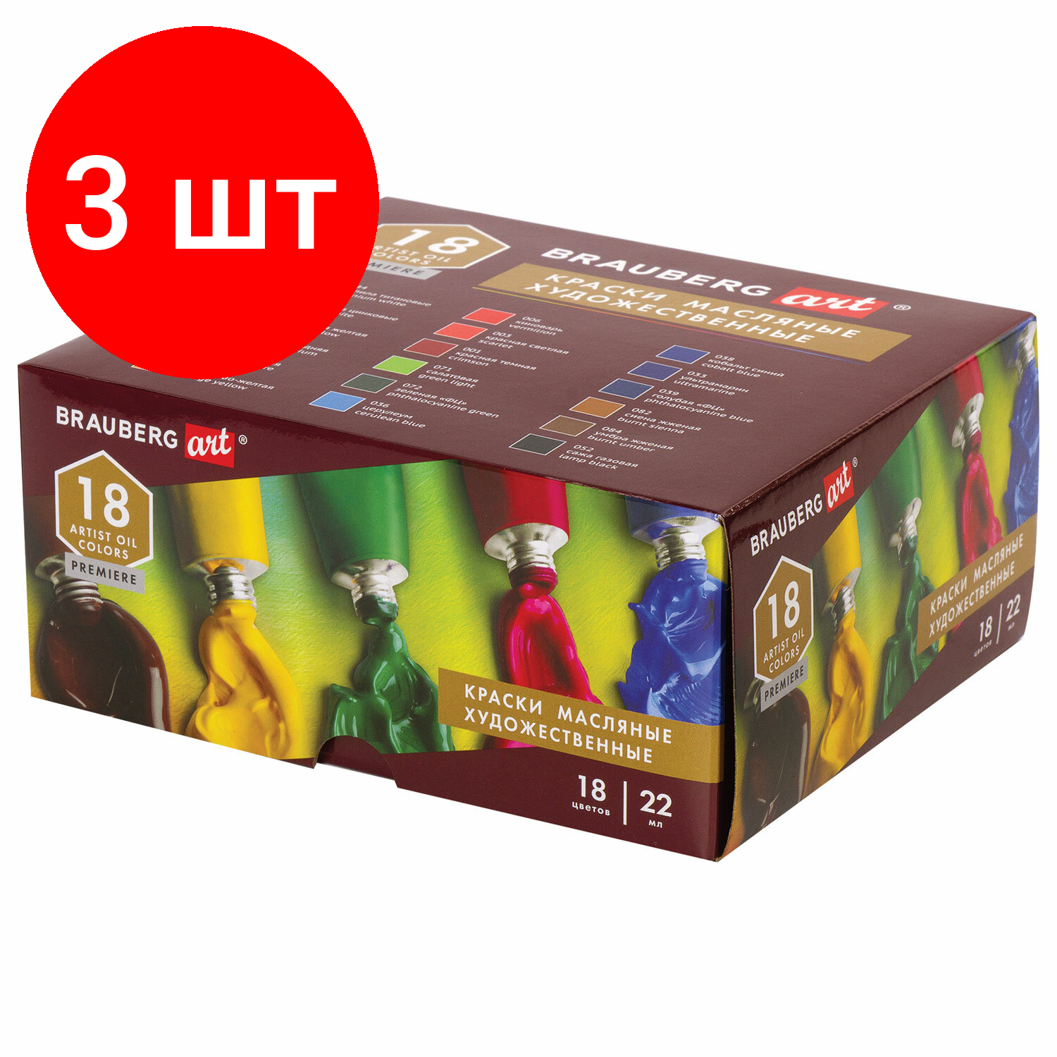 Купить Комплект 3 шт, Краски масляные художественные BRAUBERG ART PREMIERE, 18 цв по 22 мл, проф. серия, в тубах, 191459