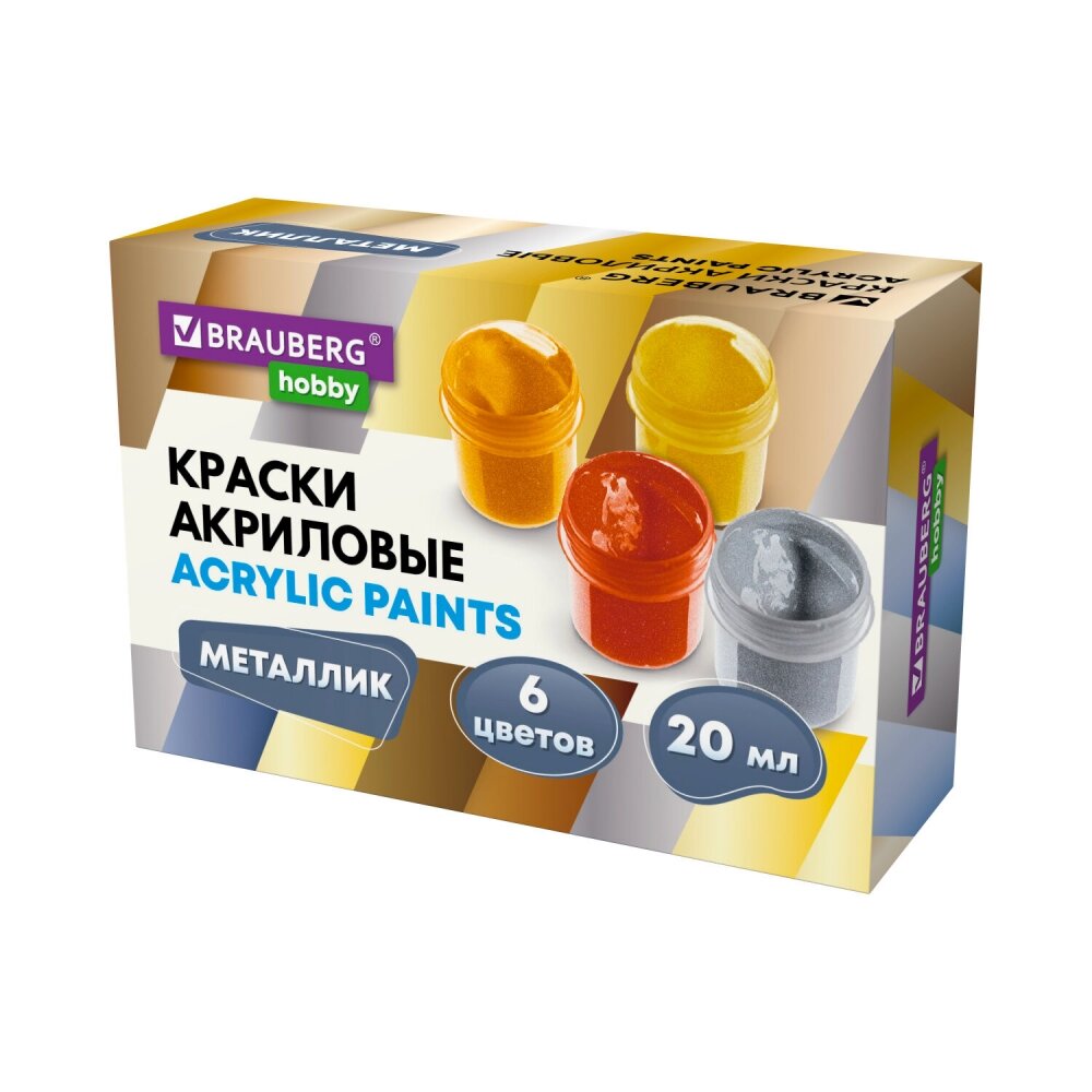 Купить Краски акриловые Brauberg металлик, для рисования и творчества, 6 цветов по 20 мл