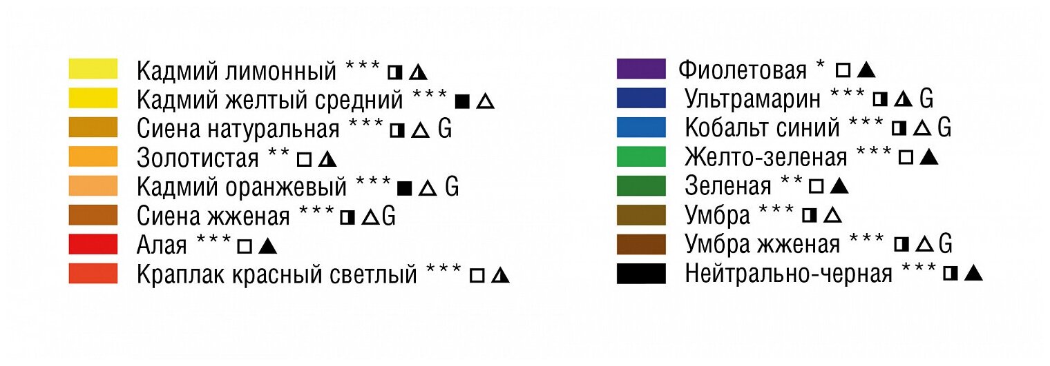 | Дополнительная информация | состав набора: кадмий лимонный, кадмий желтый средний, сиена натуральная, золотистая, кадмий оранжевый, сиена жженая, алая, краплак красный светлый, фиолетовая, ультрамарин, кобальт синий, желто-зеленая, зеленая, умбра, умбра жженая, нейтрально-черная. Упаковка - картонная коробка 12 х 8,5 х 1,5 см, форма выпуска: кювета |