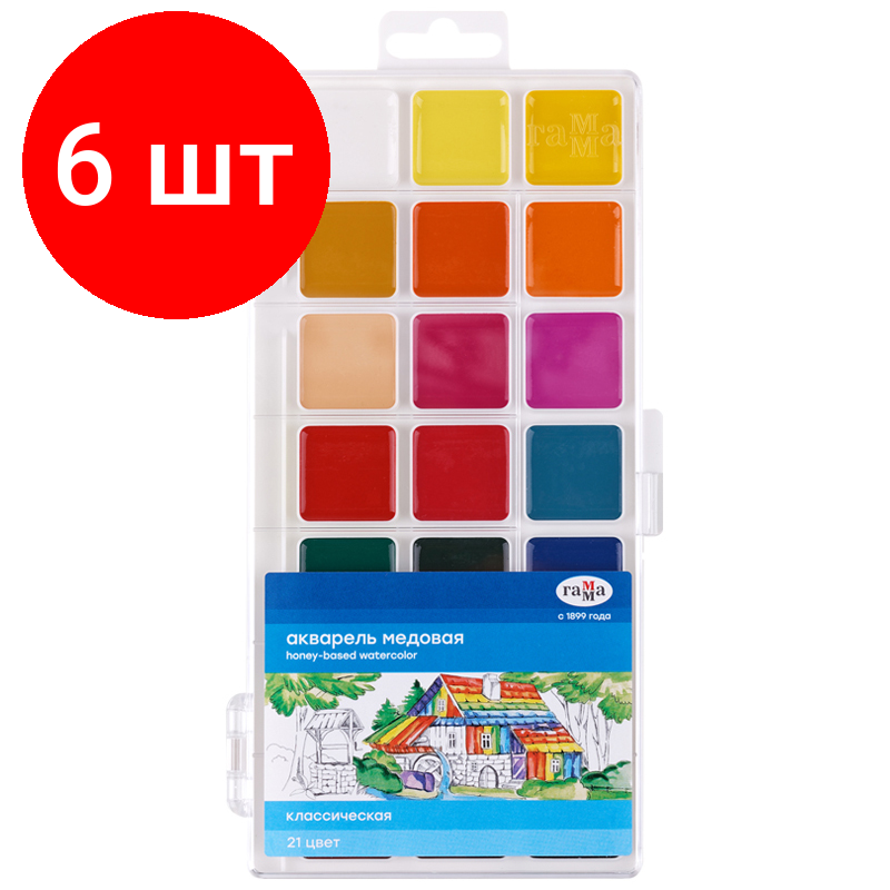 Купить Комплект 6 шт, Акварель Гамма "Классическая", медовая, 21 цвет, без кисти, пластик. упак., европодвес NEW