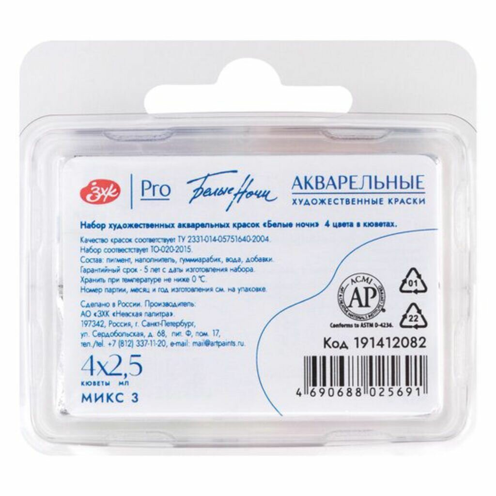 Купить Акварельные краски худож. 4цв.*2,5мл Белые Ночи, кюветы, пластик №3
