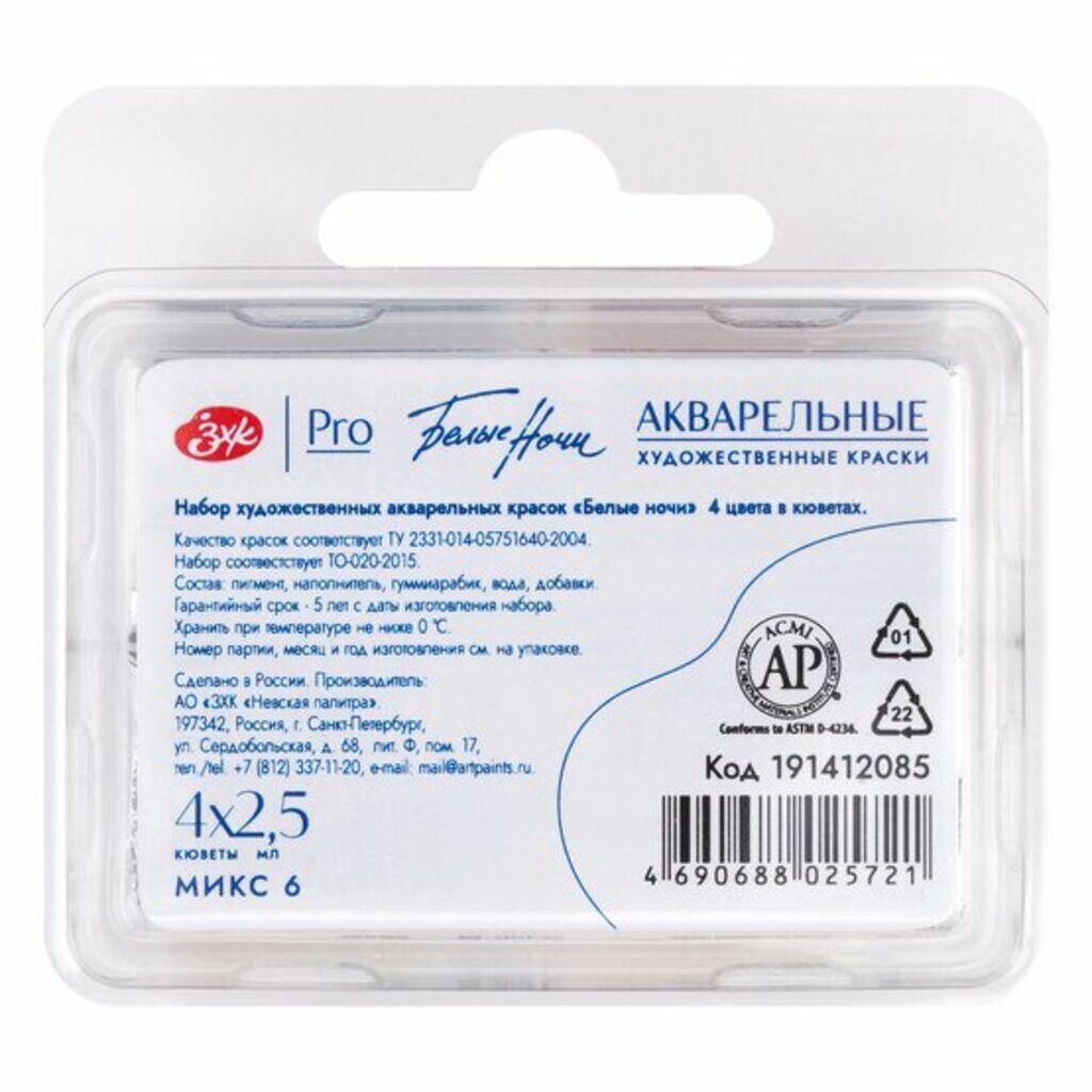 Купить Акварельные краски худож. 4цв.*2,5мл Белые Ночи, кюветы, пластик №6