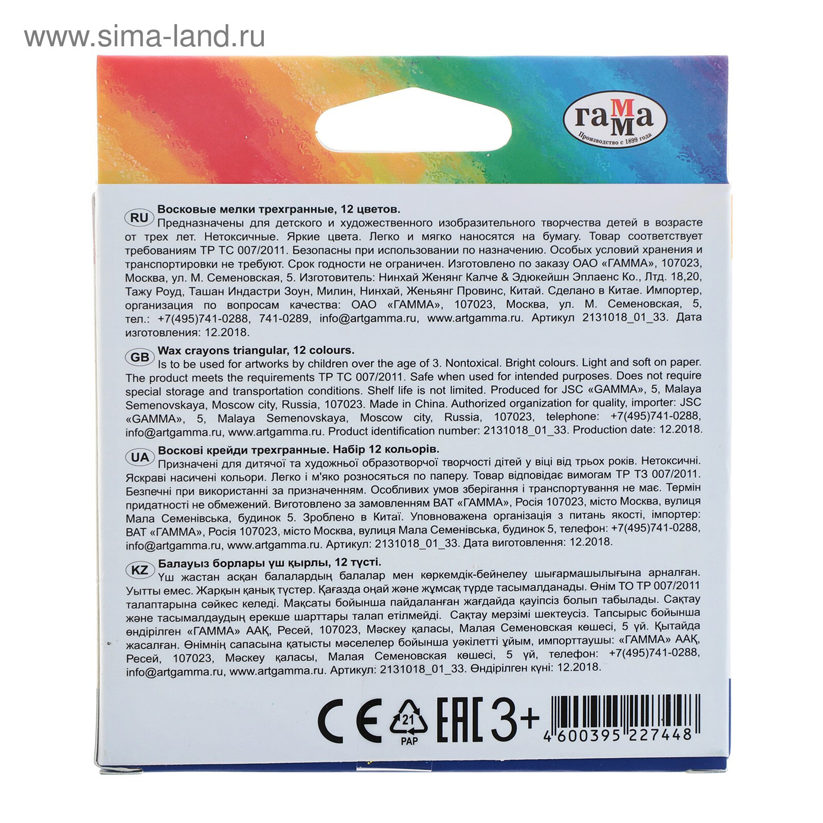 Купить Мелки восковые Гамма Классические,трехгр., 8,2x90 мм, 12 цв., 2131018_01_33
