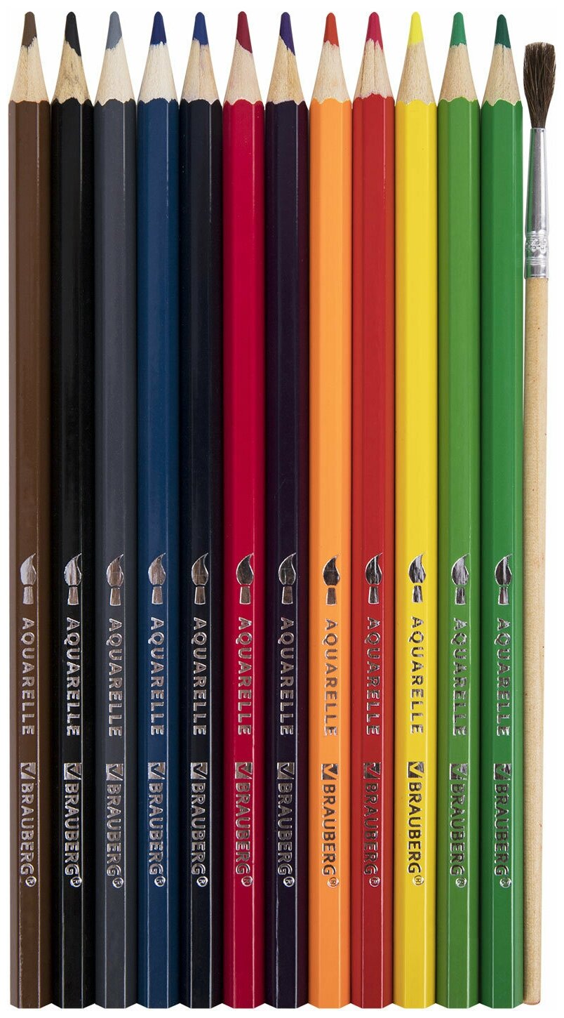 Купить Карандаши цветные акварельные BRAUBERG 24 цвета с кистью, шестигранные, грифель 3 мм, натуральное дерево, 181849