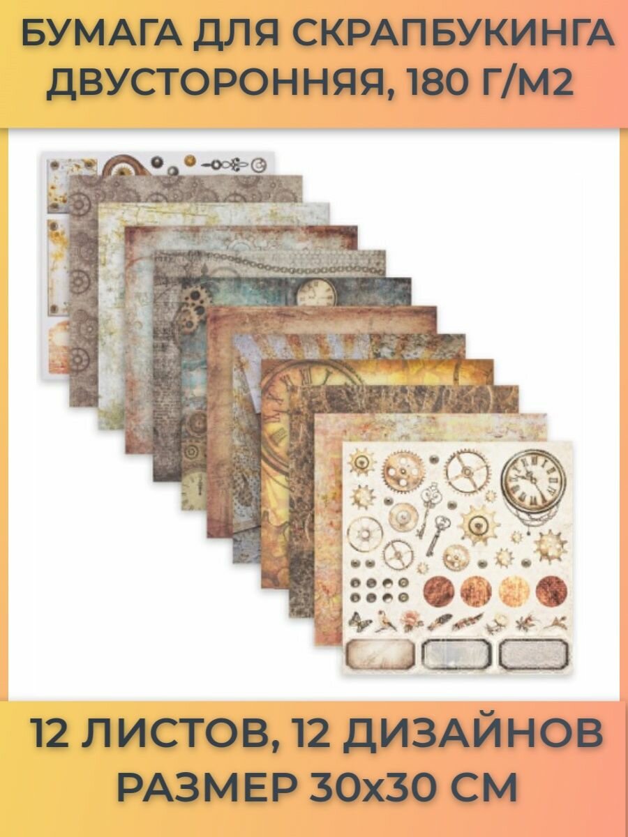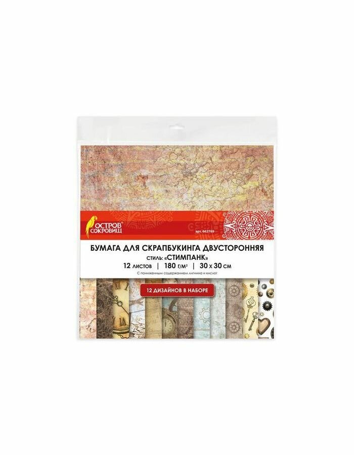 Бумага для скрапбукинга, для открыток, творчества, декора 30х30 см Стимпанк, двусторонняя, 12 листов, 12 дизайнов, 180 г/м2, Остров Сокровищ, 662769