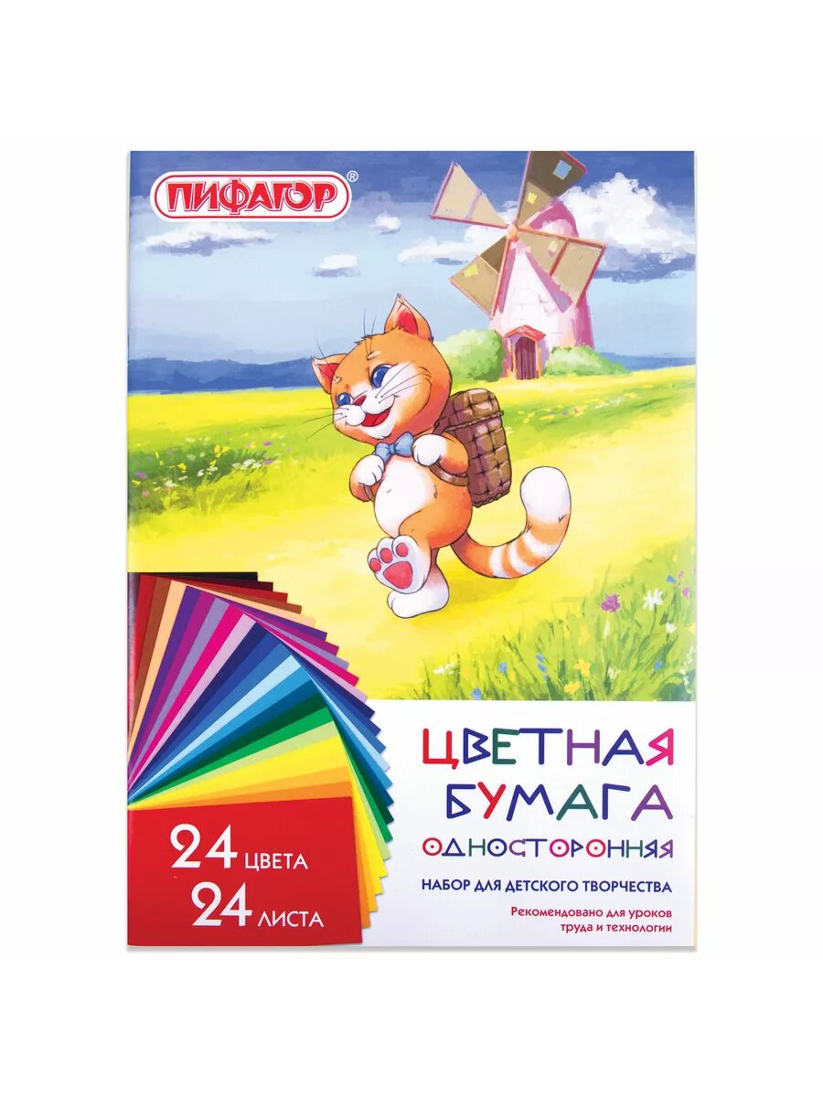 Комплект 146 шт, Цветная бумага А4 газетная, 24 листа 24 цвета, на скобе, пифагор, 200х283 мм, "Умный котик", 128002