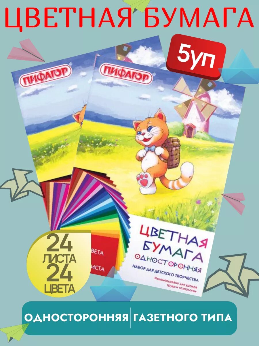 Цветная бумага пифагор, для творчества, односторонняя, формат А4, 24 цвета, 24 листа, 5 штук