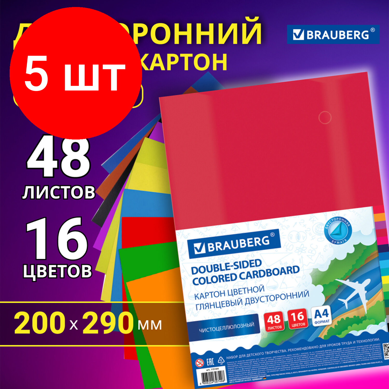 Купить Комплект 5 шт, Картон цветной А4 2-сторонний мелованный EXTRA 48 листов 16 цветов, BRAUBERG, 200х290 мм, 115164