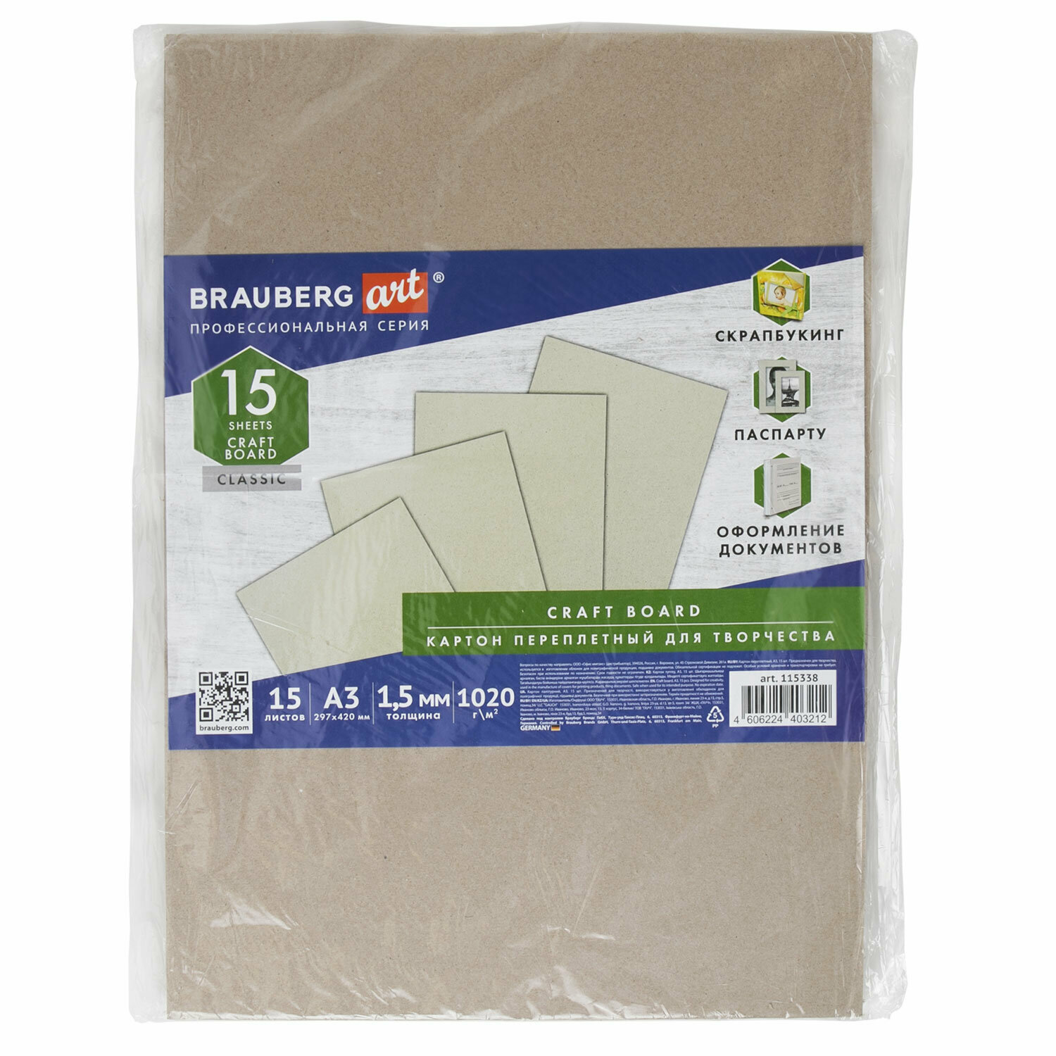 Картон переплетный Brauberg толщина 1,5 мм, А3 (297х420 мм), комплект 15 шт., ART, 115338