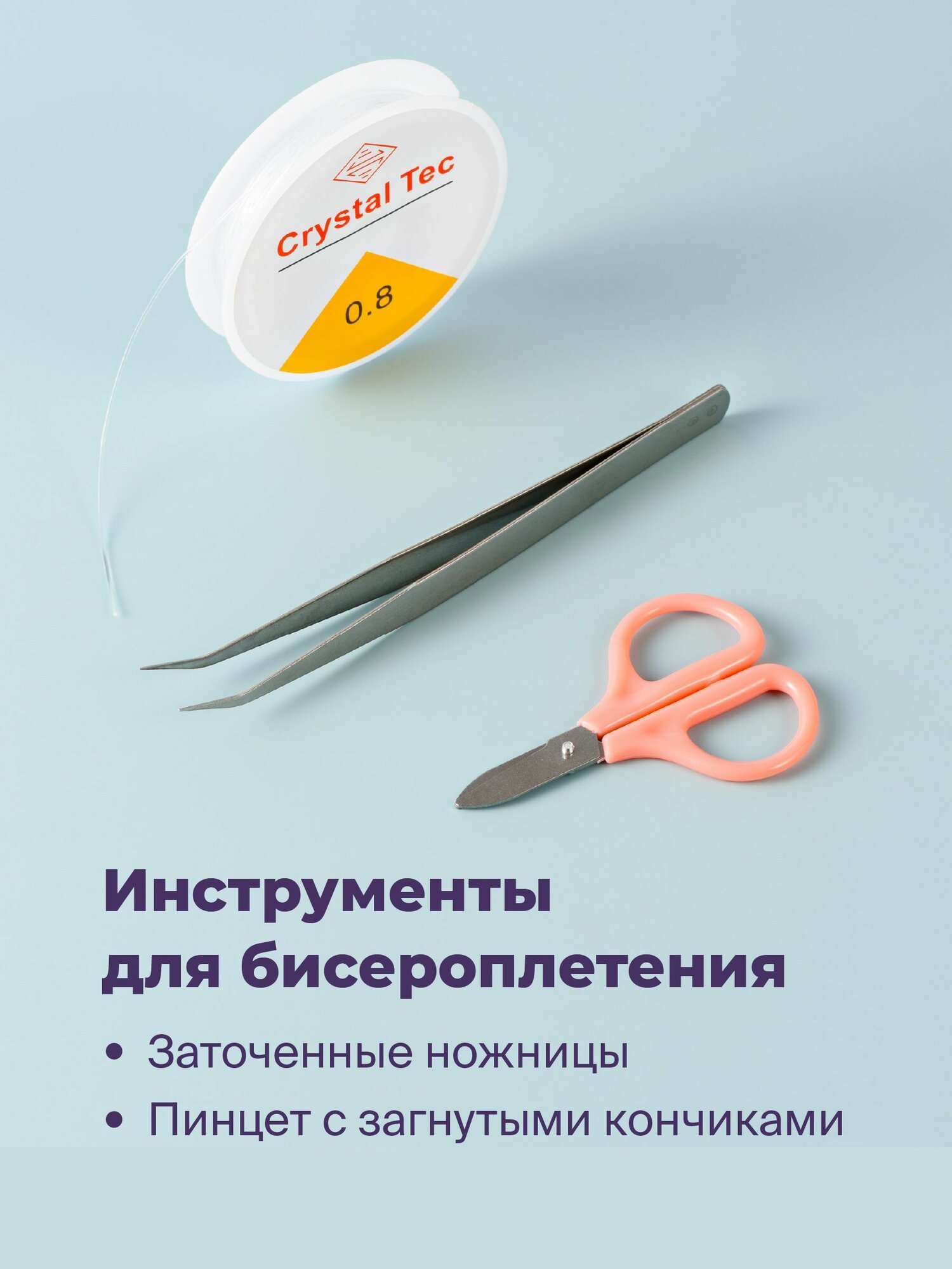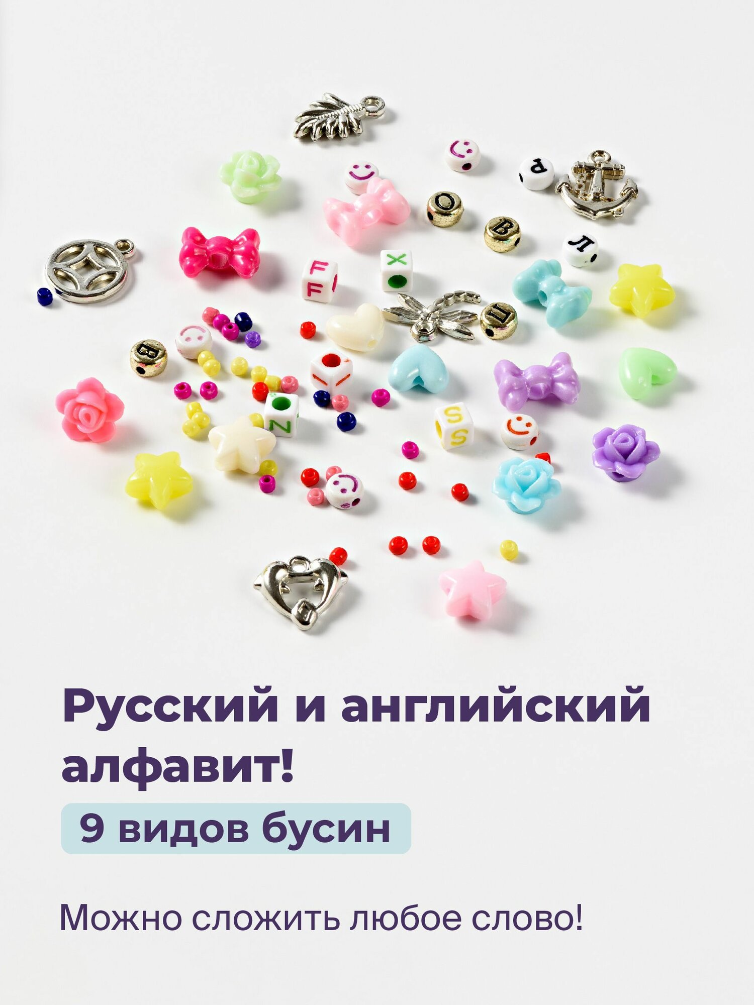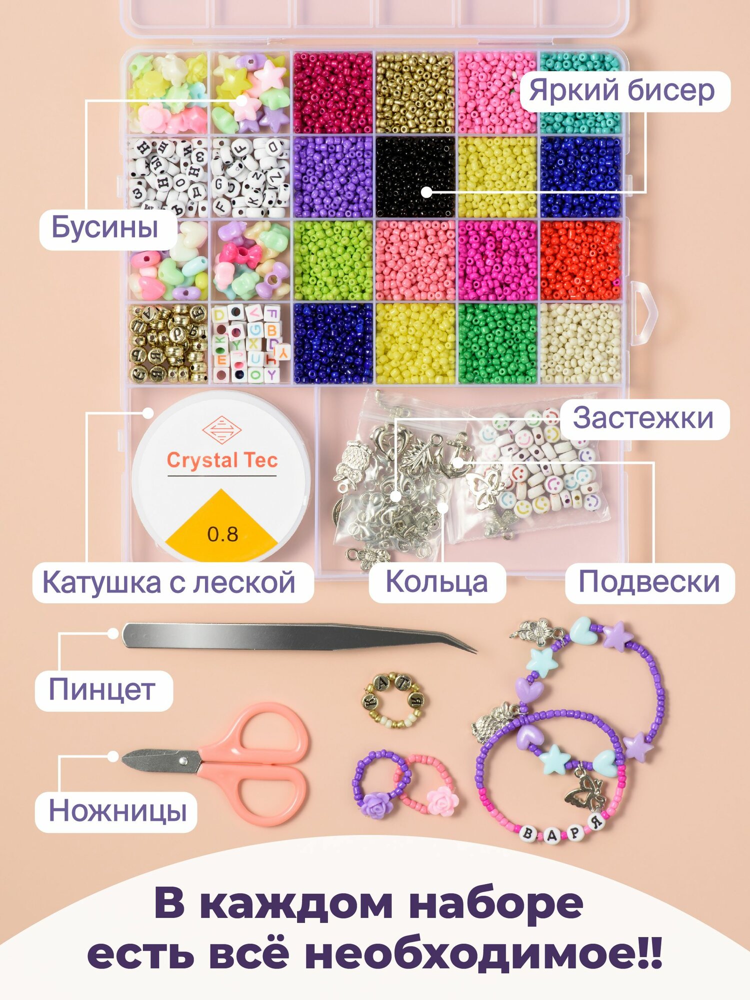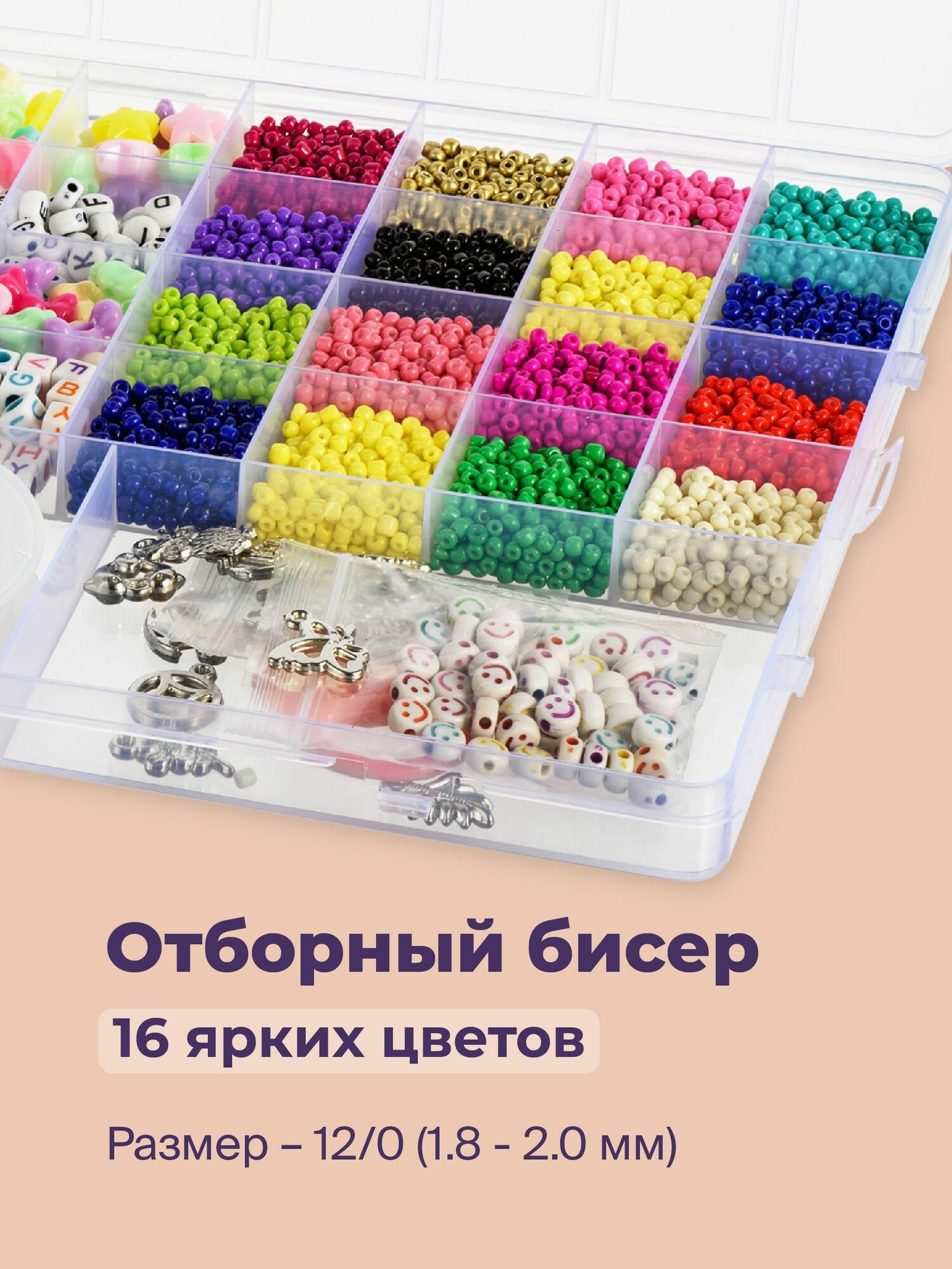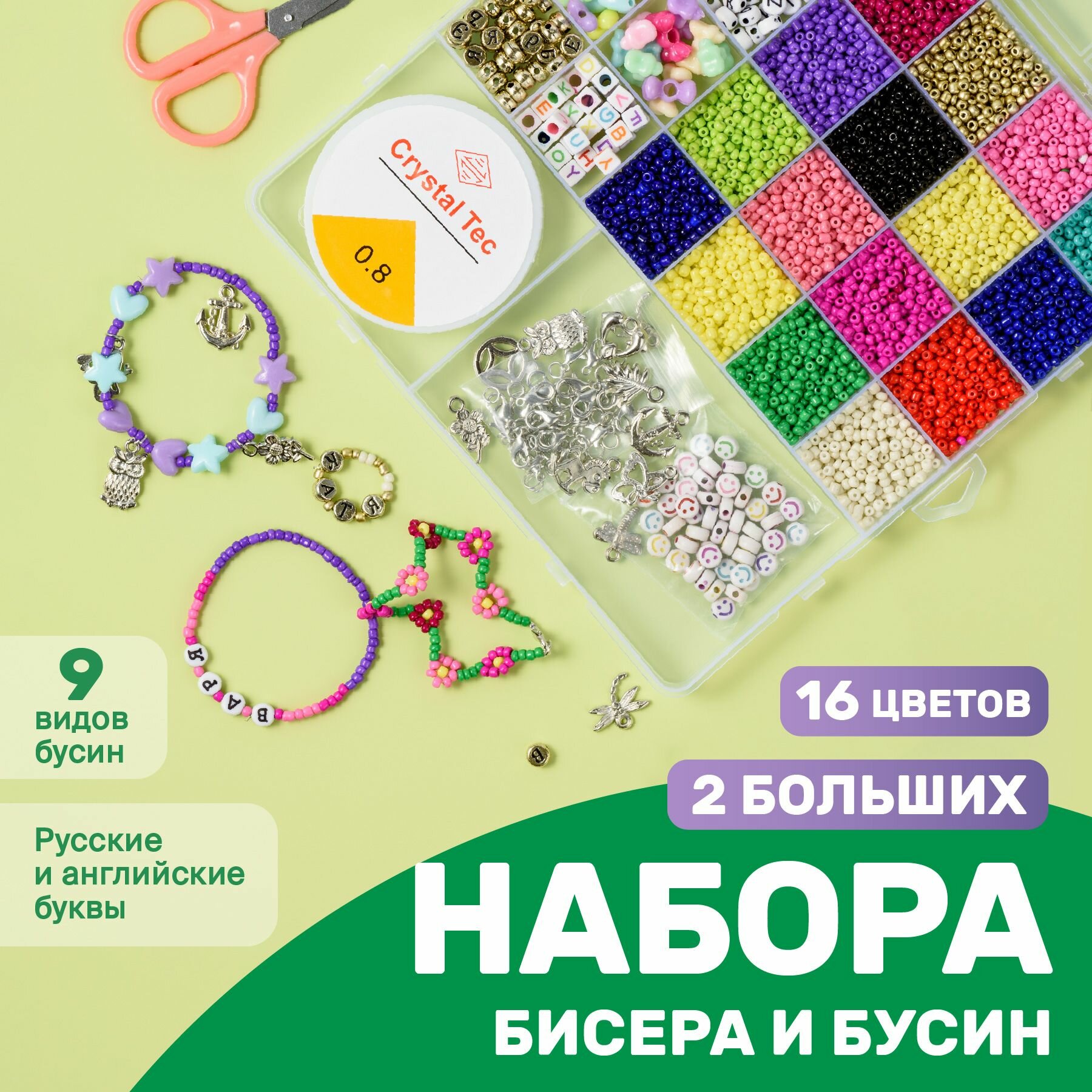 | Комплектация | 16 цветов бисера, 20 метров эластичной нити, 9 видов бусин, ножницы, пинцет, аксессуары, в виде кулонов, и застежки для готовых украшений |