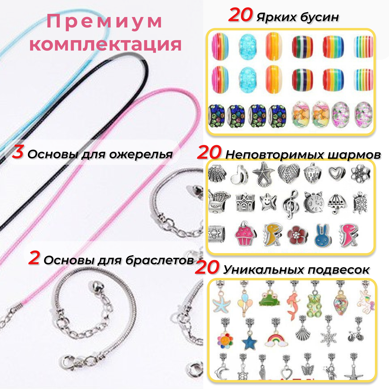 | Комплектация | Сумочка кошка, 60 шармов и бусин, 3 основы для браслетов, 3 основы для ожерелий |