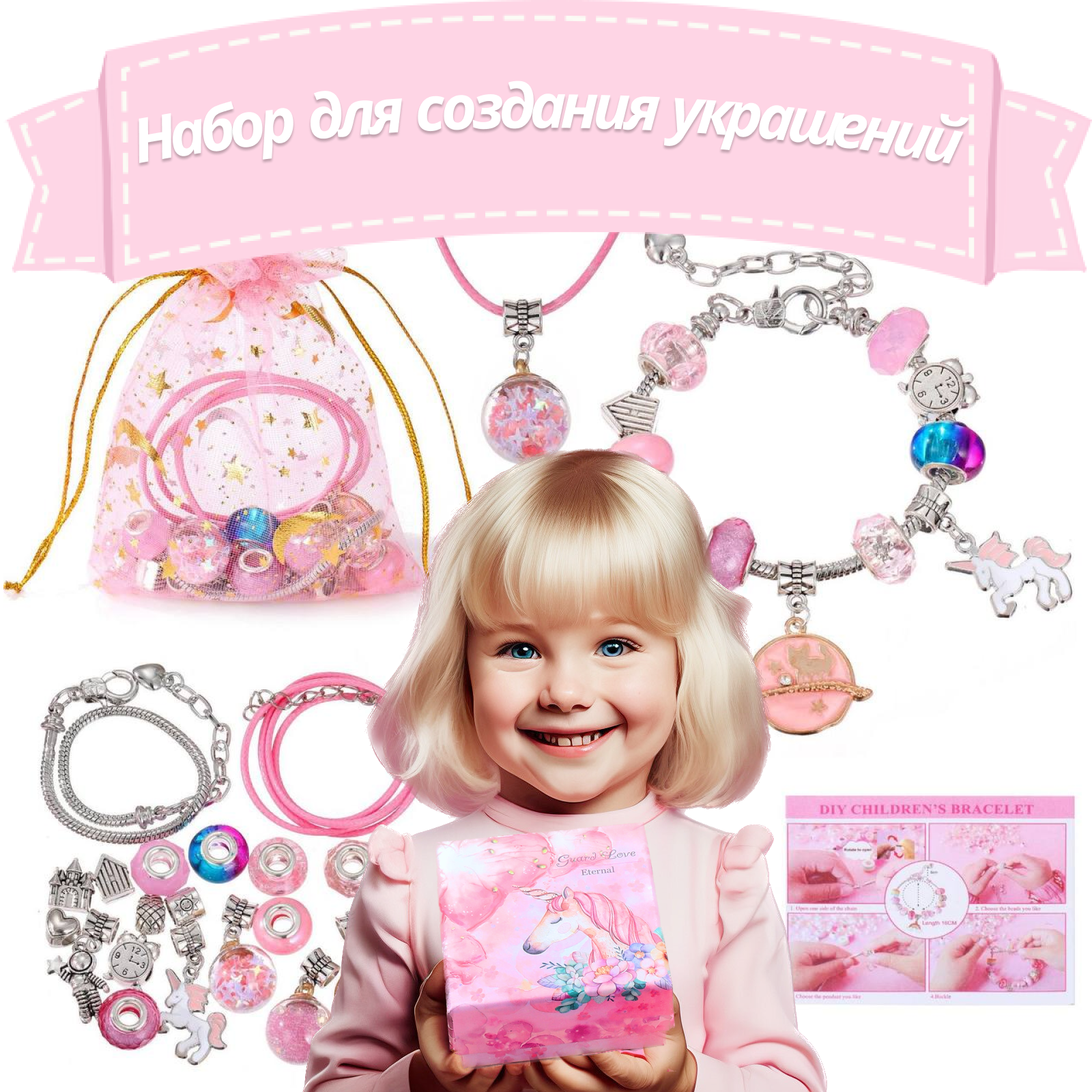 Купить Подарочный Набор для создания браслетов, украшений и творчества в подарочной коробочке, бижутерия для девочек, подарок девочке в маленькой коробочке с единорогом, подарок для девочки на День рождения