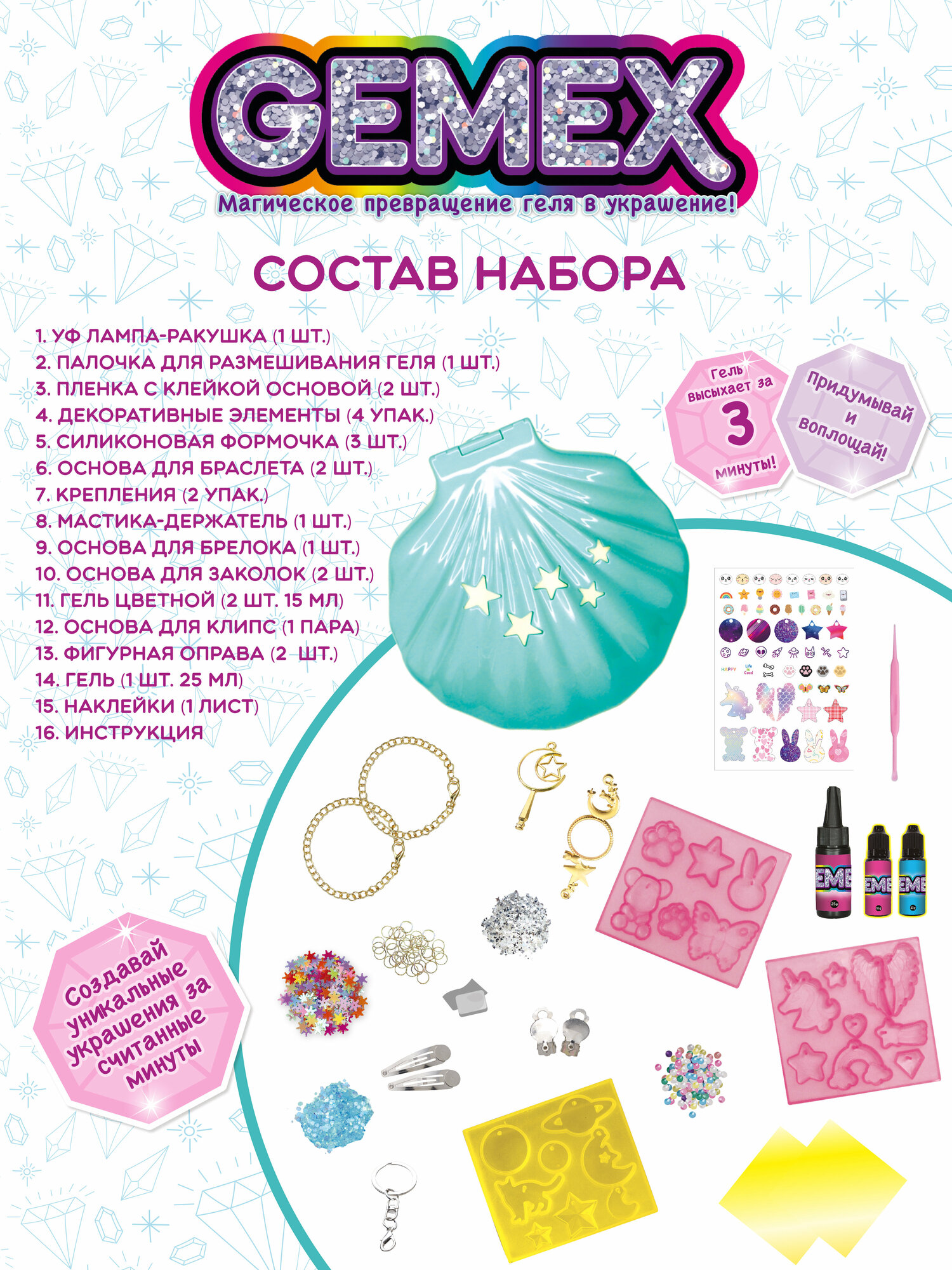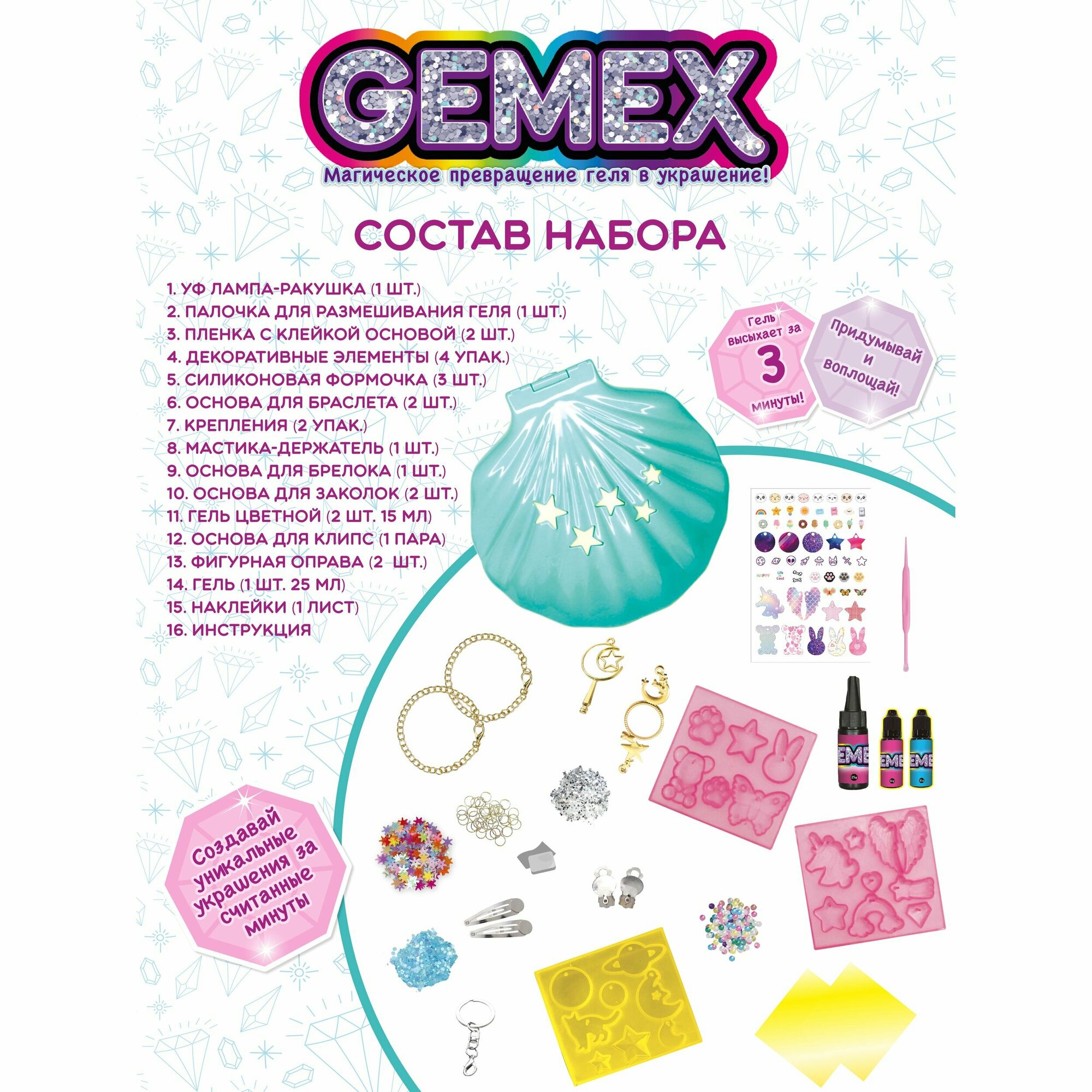 | Комплектация | УФ лампа-ракушка со св. и зв.( 1 шт.), гель (1 шт. 25 мл и 2 шт 15 мл), декортивные элементы ( 4 упак.), бумага с клейкой основной (2 шт), мастика-держатель (1 шт), основа для заколок ( 2 шт), основа для браслета (2 шт.), основа для клипс (1 пара), кольцо (1 шт), основа для брелока (1 шт.), наклейки (1 лист), палочка для размешивания геля (1 шт), силиконовая формочка (3 шт.), металл крепления (кольца) ( 2 упак), инструкция |
