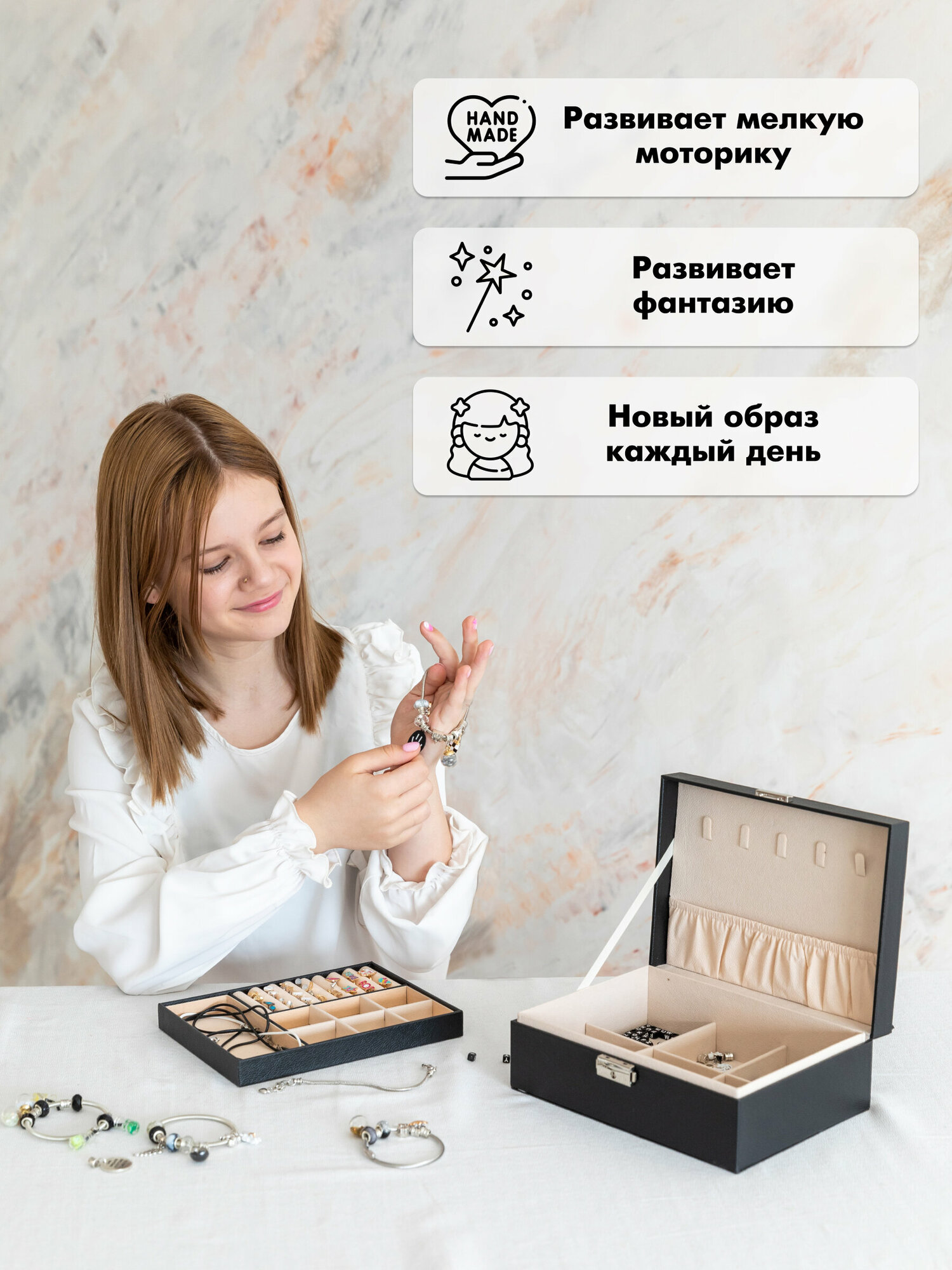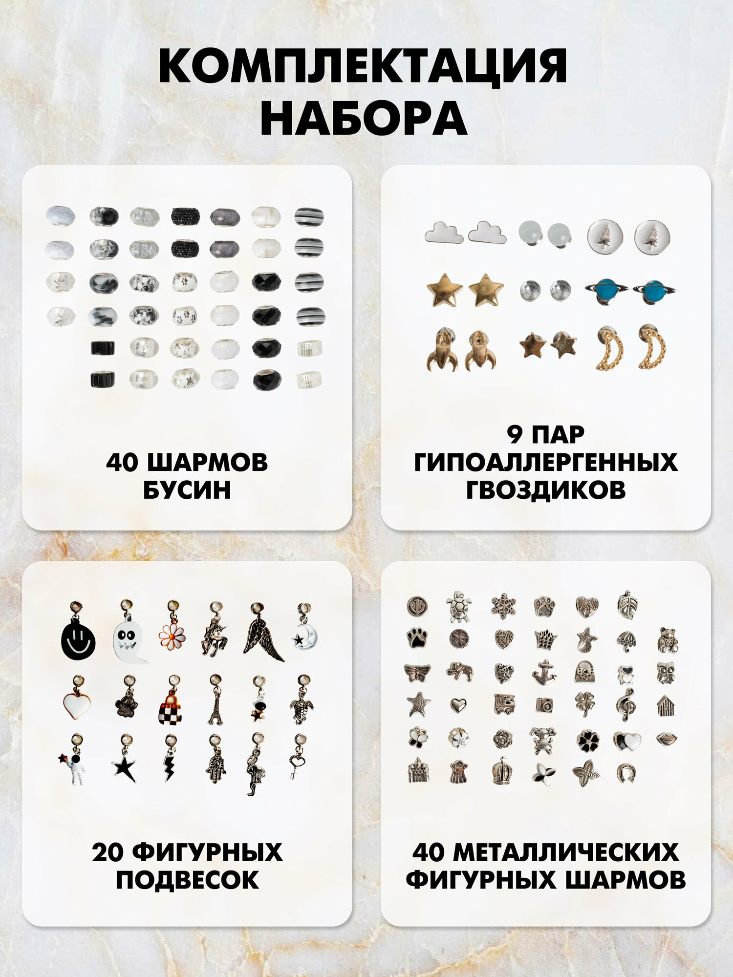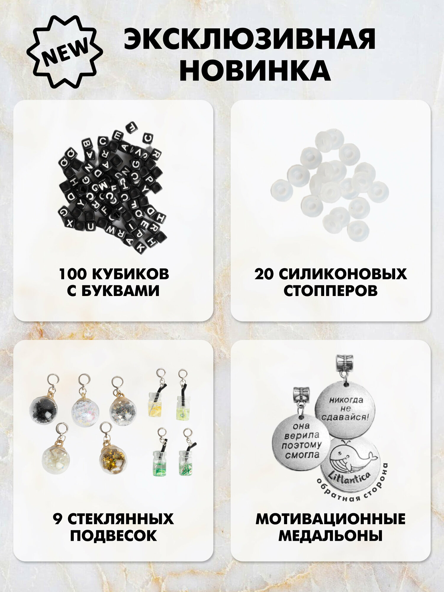 | Комплектация | 5 шнурков на шею, 6 базовых браслетов из них: 2 браслета с карабином, 2 пружинных браслета, 1 регулирующийся браслет с бегунком, 1 круглый проволочный браслет. 22 подвески включая мотивационные, 9 подвесок - стеклянных бутылочек, 40 металлических шармов, 40 шармов бусин, 100 кубиков с буквами, 20 силиконовых стоперов, 9 гвоздиков, 6 колец, бархатная шкатулка. |