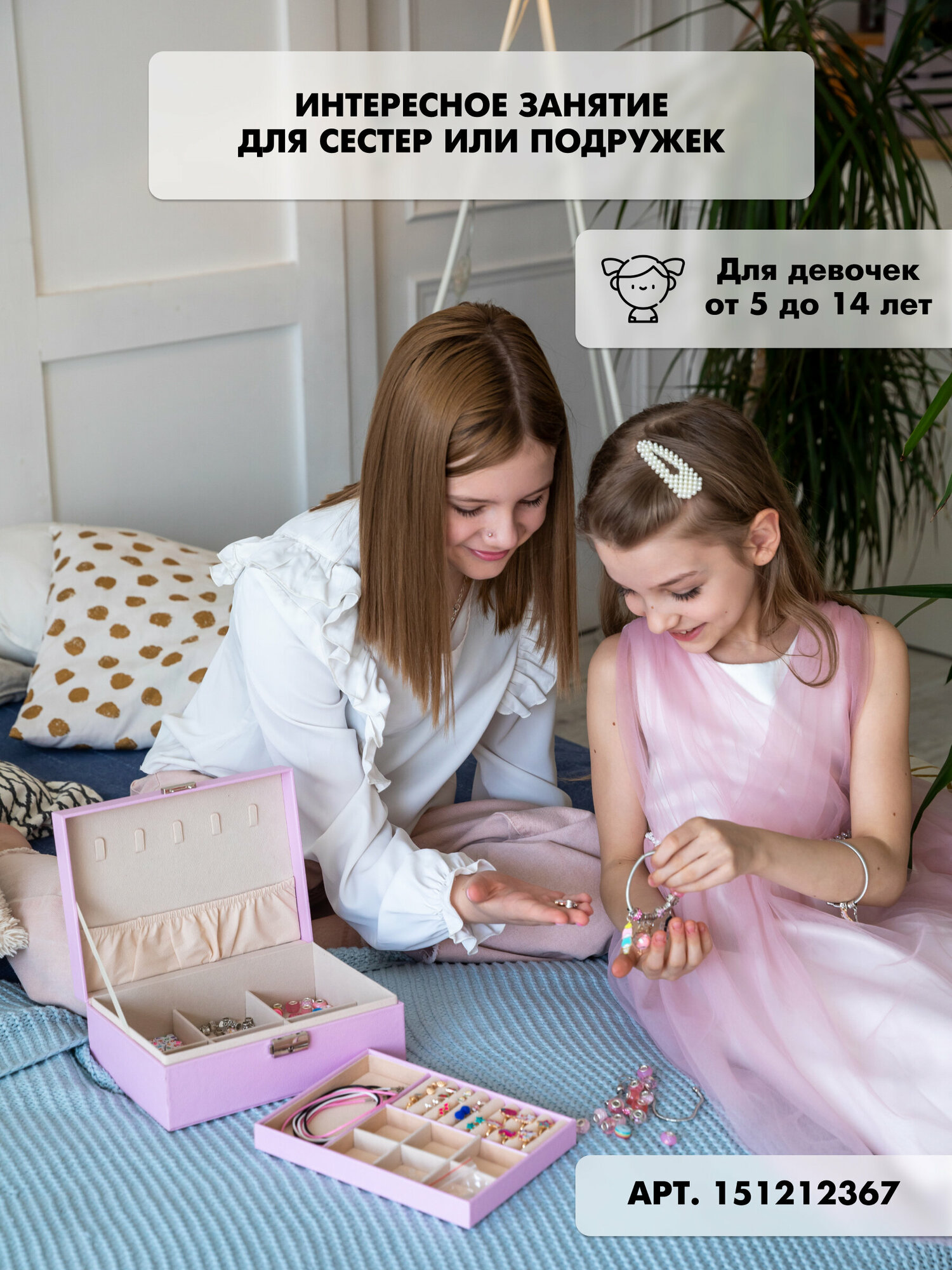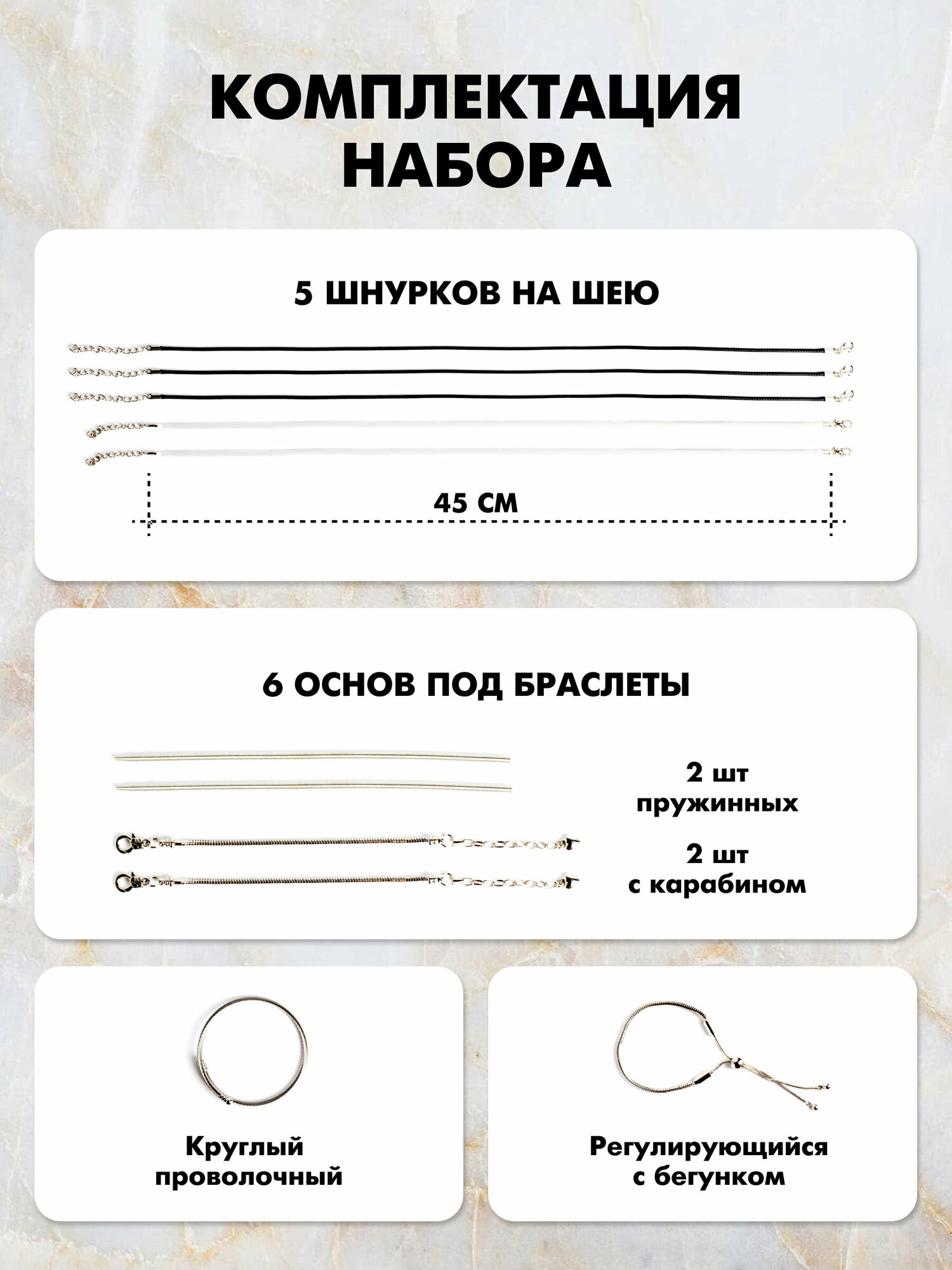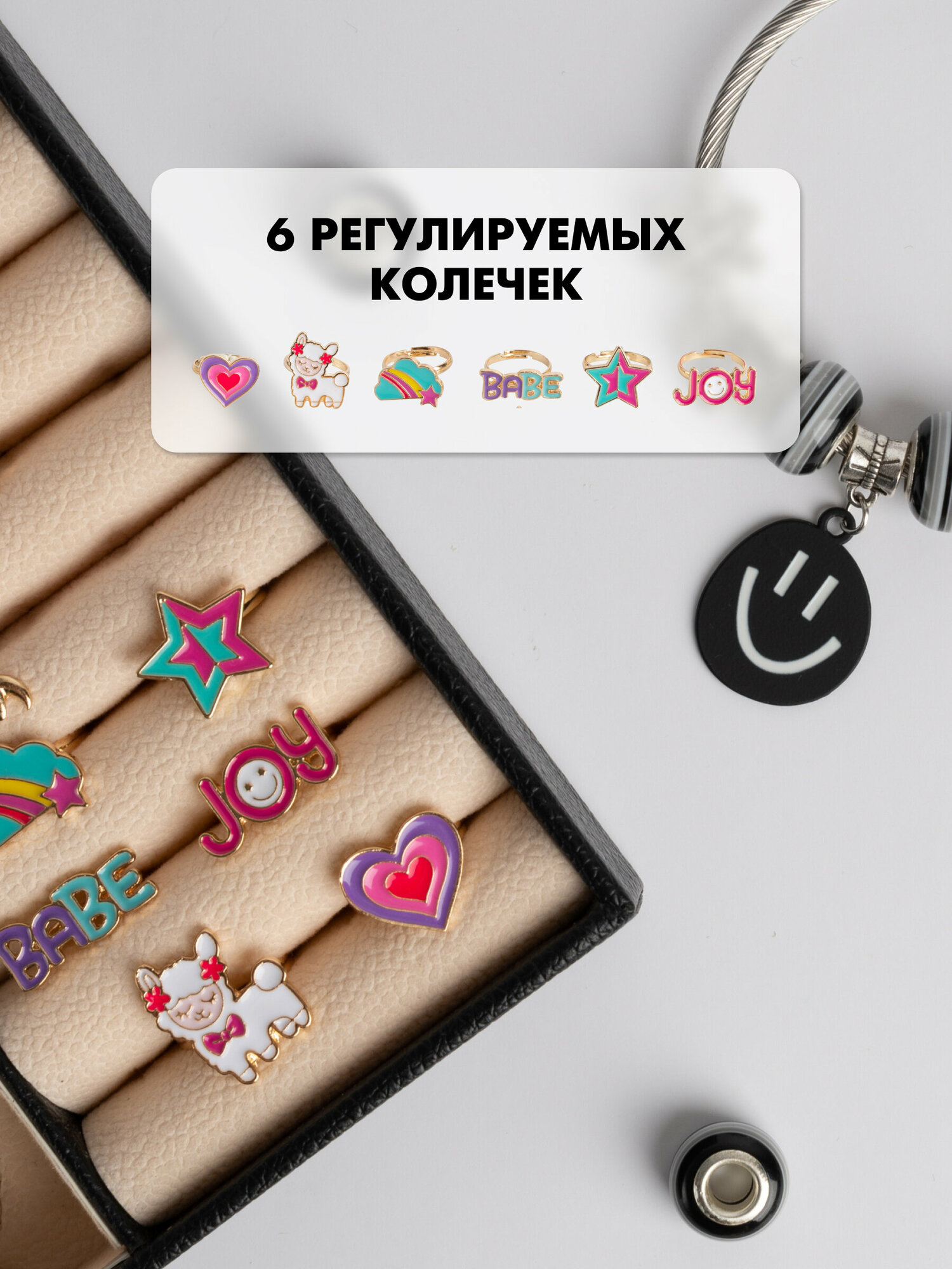 | Комплектация | 5 шнурков на шею, 6 базовых браслетов из них: 2 браслета с карабином, 2 пружинных браслета, 1 регулирующийся браслет с бегунком, 1 круглый проволочный браслет. 22 подвески включая мотивационные, 9 подвесок - стеклянных бутылочек, 40 металлических шармов, 40 шармов бусин, 100 кубиков с буквами, 20 силиконовых стоперов, 9 гвоздиков, 6 колец, бархатная шкатулка. |