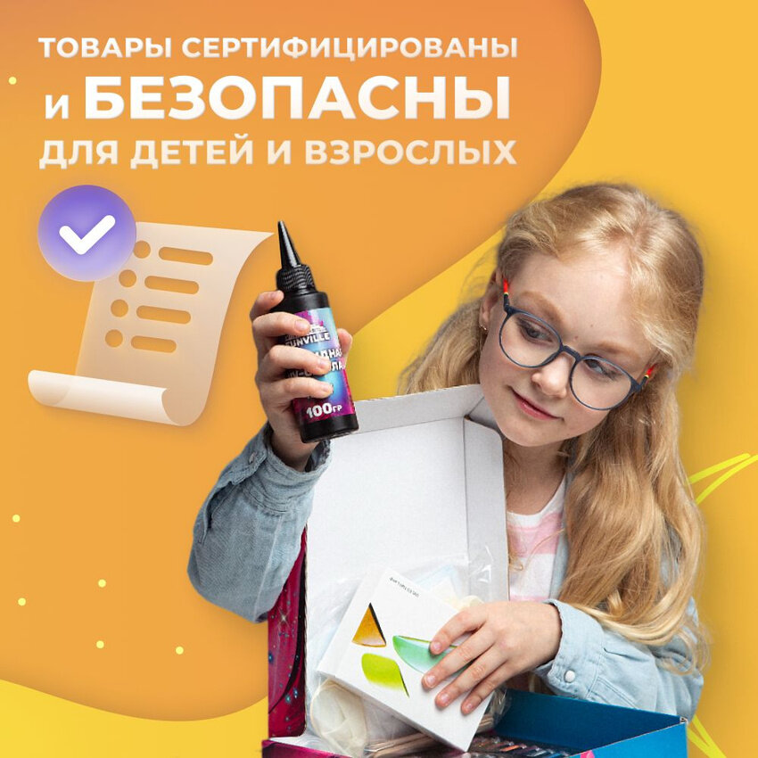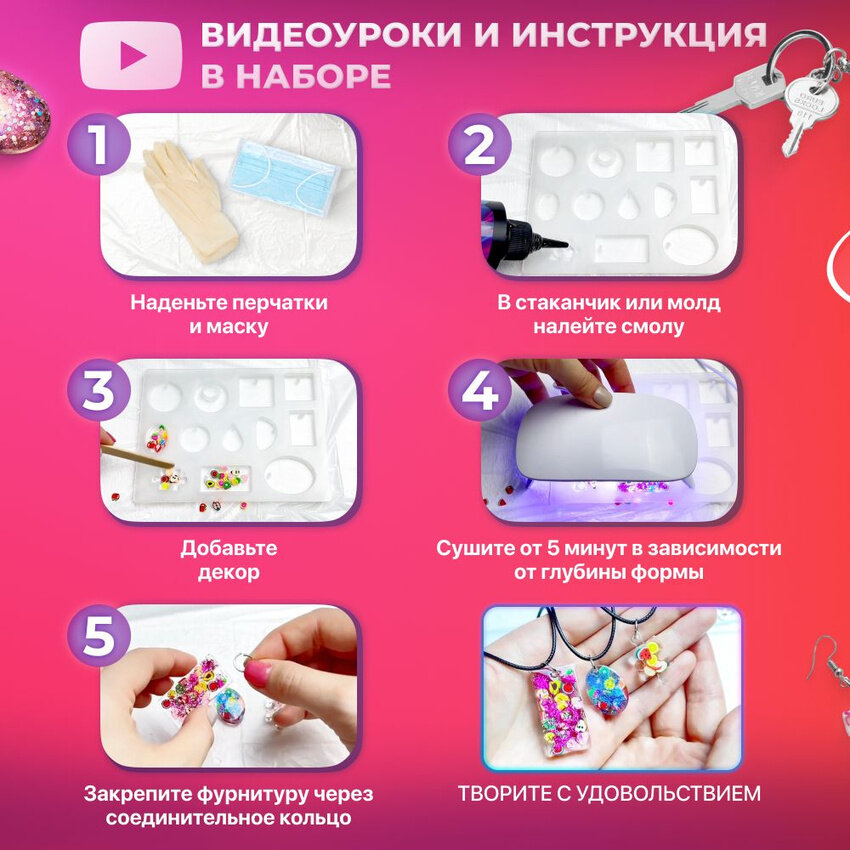 | Комплектация | уф-смола 200 г; UV-лампа; силиконовый молд 6 шт; фурнитура; расходники; подарочная упаковка; Глиттер; сухоцветы; краситель 3 шт; декоративный наполнитель; подвесы для сережек; крепление для брелоков |