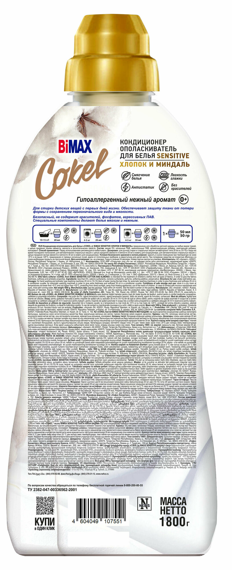 Купить Кондиционер ополаскиватель для белья Cokel от BiMAX Хлопок и миндаль, 1,8 кг
