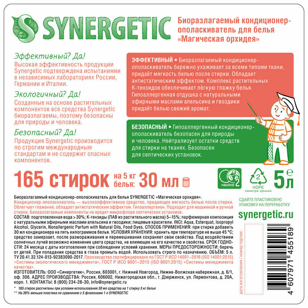 Кондиционер-ополаскиватель для белья Synergetic "Магическая орхидея",гипоаллергенный,5 л интересное: