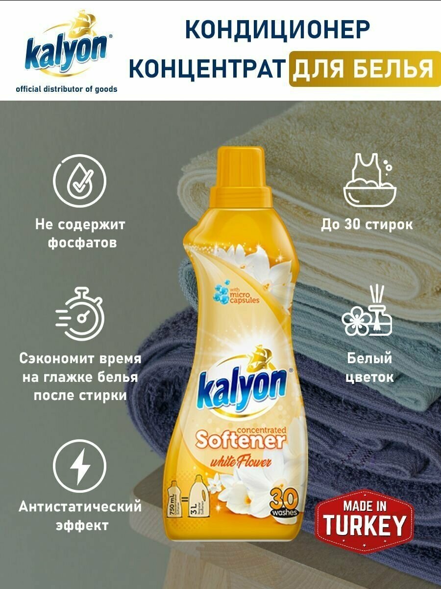 Кондиционер для белья Kalyon средство для стирки концентрированный, гипоаллергенный приятный аромат белый цветок 0.75 литра