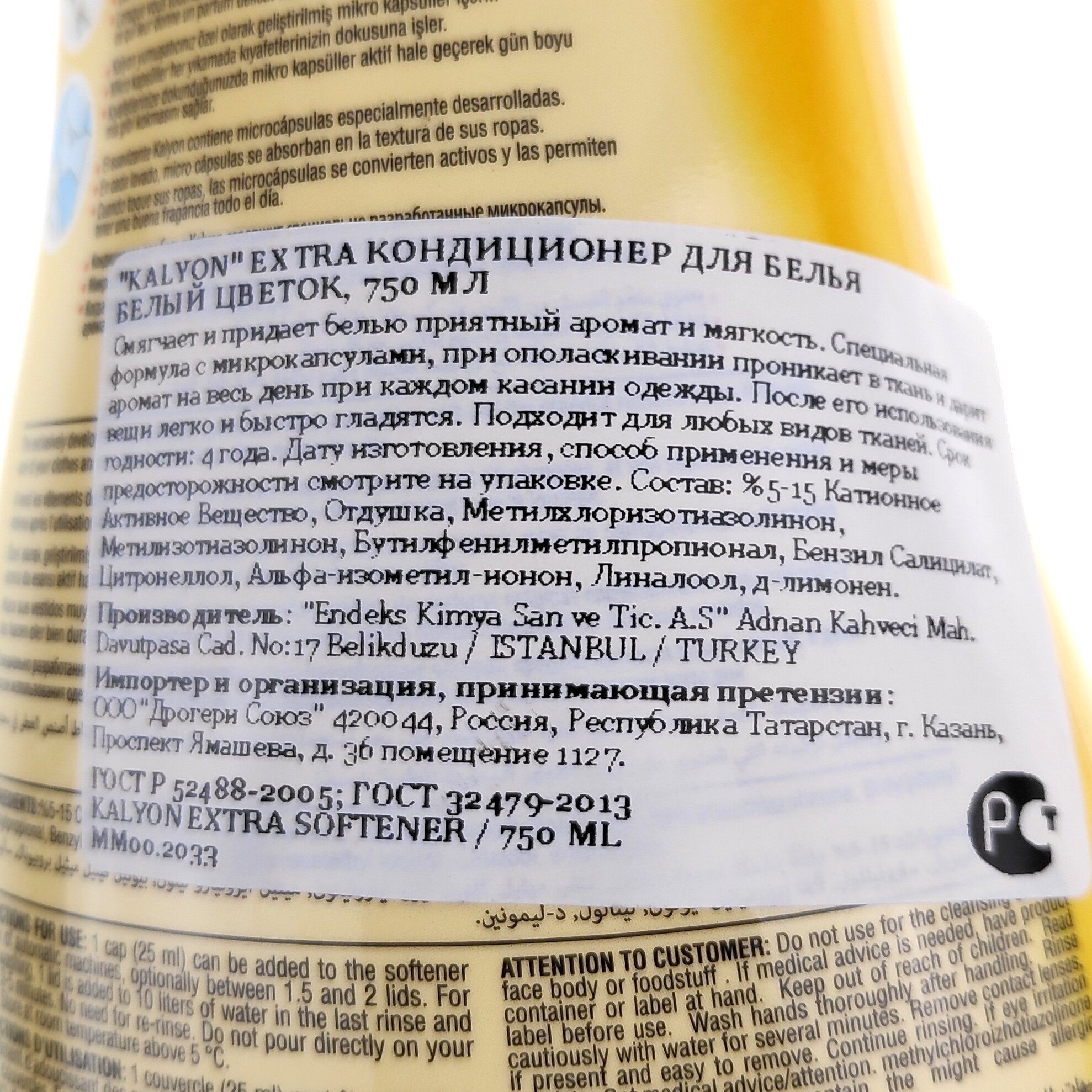 | Состав | %5-15 Катионное Активное Вещество, Отдушка, Метилхлоризотиазолинон, Метилизотиазолинон, Бутилфенилметилпропионал, Бензил Салицилат, Цитронеллол, Альфа-изометил-ионон, Линалоол, длимонен. |