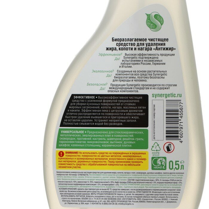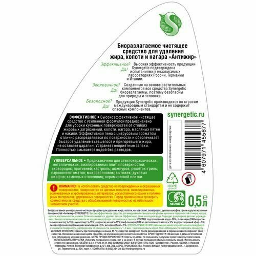 | Дополнительная информация | высокоэффективное чистящее средство "Антижир" SYNERGETIC с усиленной формулой предназначено для уборки кухонных поверхностей от стойких жировых загрязнений, копоти, нагара, масляных пятен и накипи., предназначено для стеклокерамических, металлических, эмалированных плит и поверхностей, сковородок, противней, кастрюль, шампуров, решёток-гриль, пароконвектоматов, микроволновок, вытяжек, духовых шкафов, каменных столешниц, керамической плитки и других кухонных поверхностей, обладает свежим цитрусовым ароматом благодаря гипоаллергенной парфюмерной композиции с эфирными маслами мандарина, лемонграсса, лимона, апельсина и перечной мяты., средство устраняет неприятные запахи, эффективно даже в холодной воде, полностью смывается, не оставляя разводов, средство подходит для уборки в детских учреждениях, оно также безопасно для септических установок., попадая в среду септика, оно "понятно" для микроорганизмов и без труда распадается на простые соединения. |