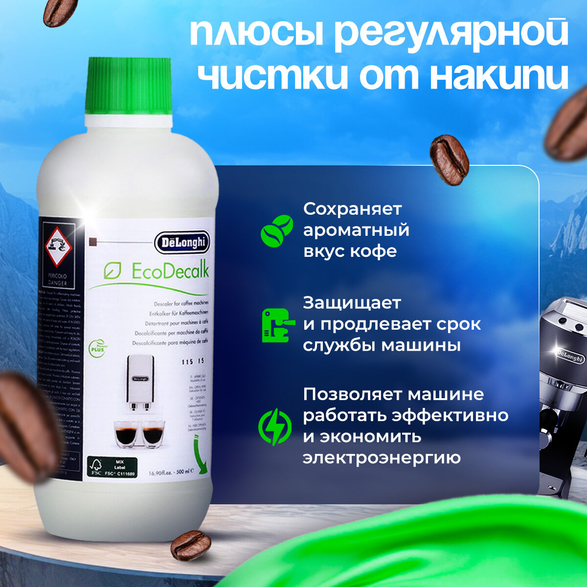 Антинакипин DeLonghi "Eco Decalk", очиститель накипи для автоматических кофемашин, 500 мл 4 штуки интересное: