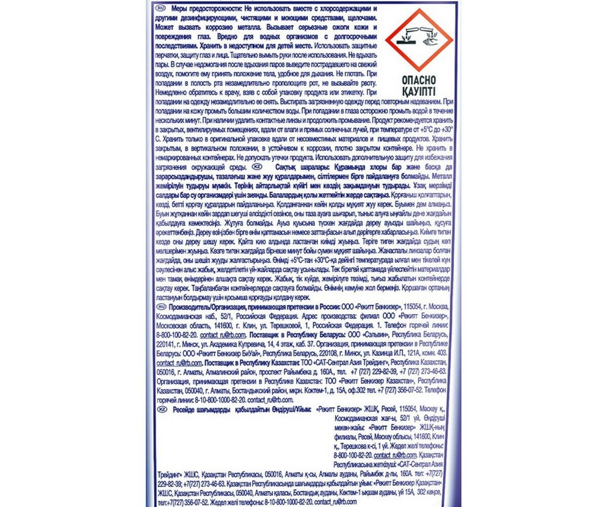 | Дополнительная информация | хранить при температуре от +5 до +30 вдали от прямых солнечных лучей, в сухом, прохладном и вентилируемом месте, НЕ использовать вместе с хлорсодержащими и другими дезинфицирующими, чистящими и моющими средствами, щелочами |
