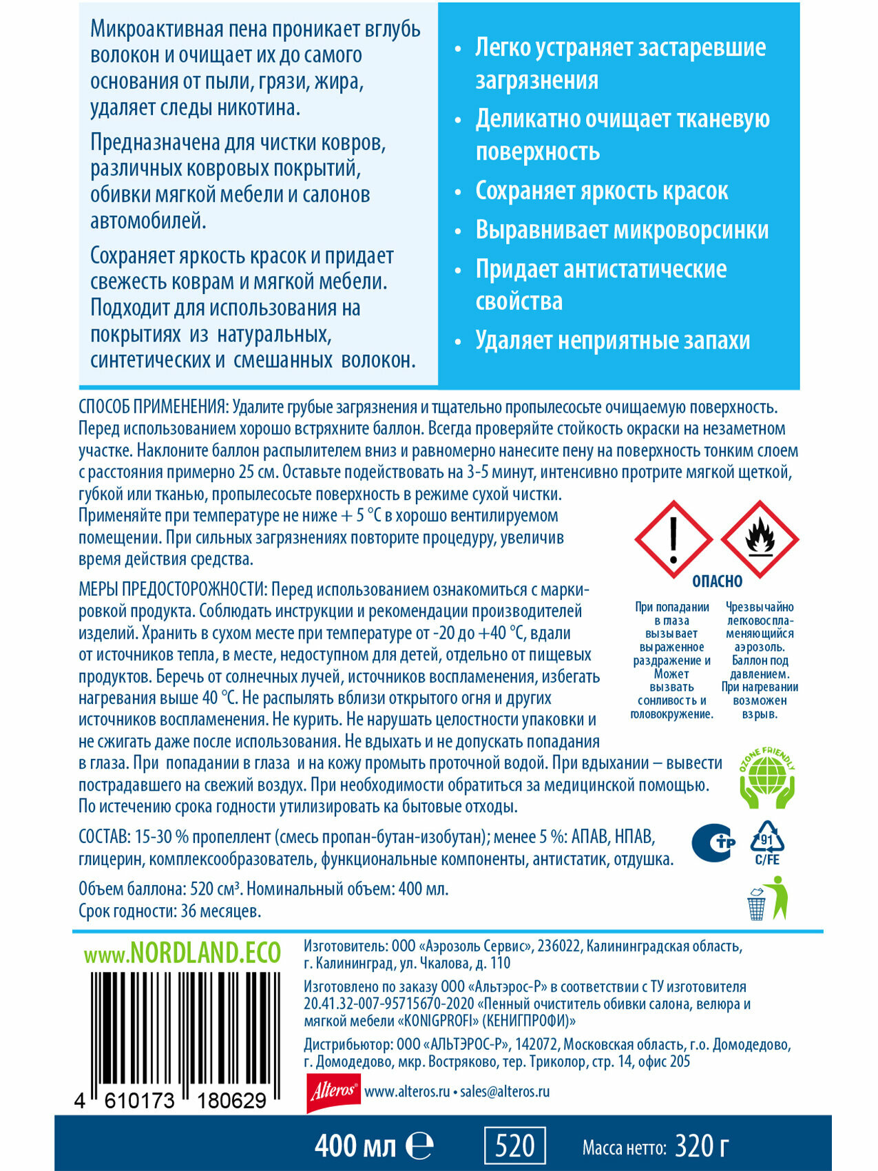 | Эффект | антистатический / выведение пятен / устранение неприятных запахов |