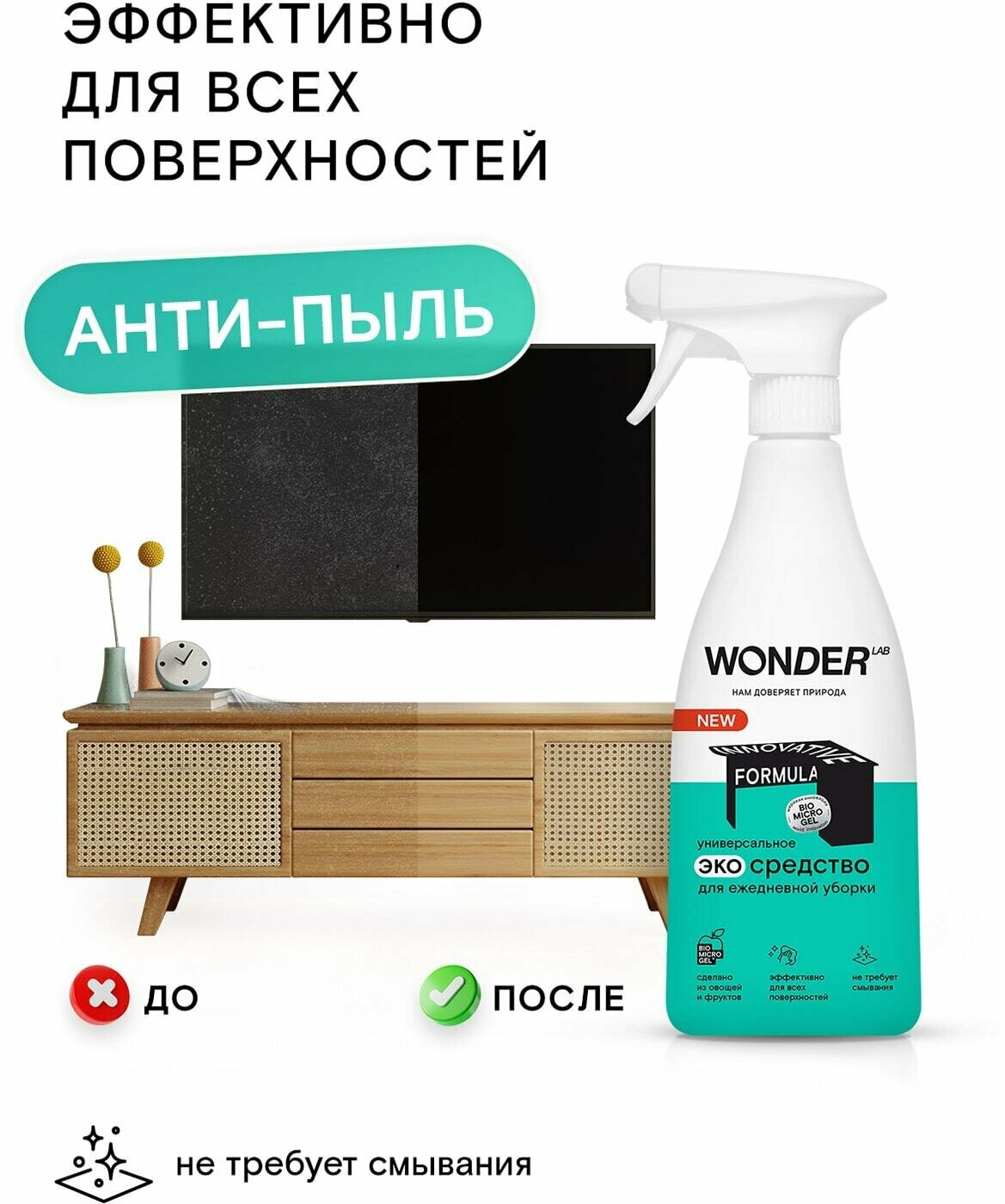Универсальное чистящее эко средство для уборки дома WONDER LAB, спрей для мебели и любых поверхностей, антипыль, полироль, 550 мл интересное: