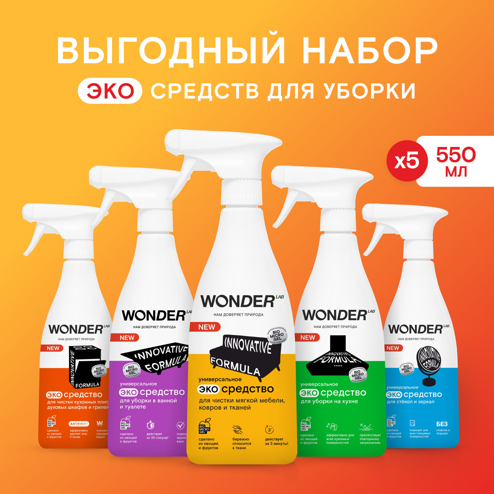 Набор для уборки дома, ванной и кухни универсальный 5 средств WONDER LAB