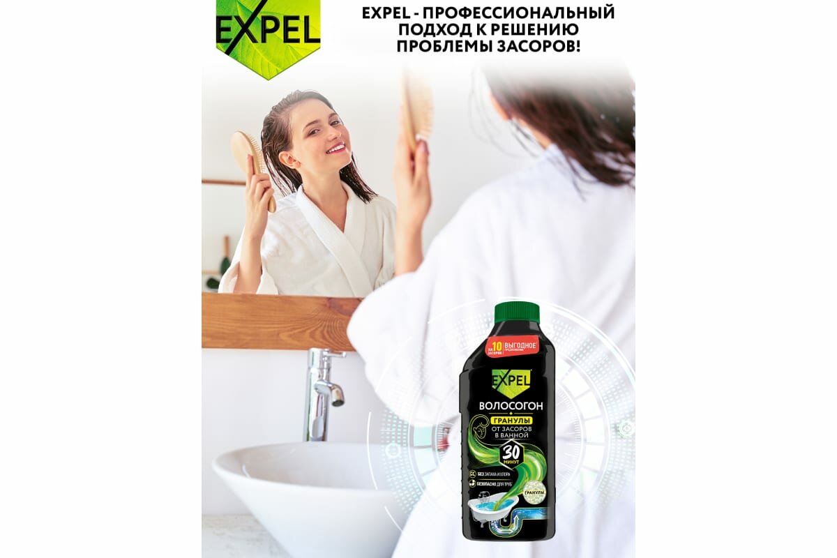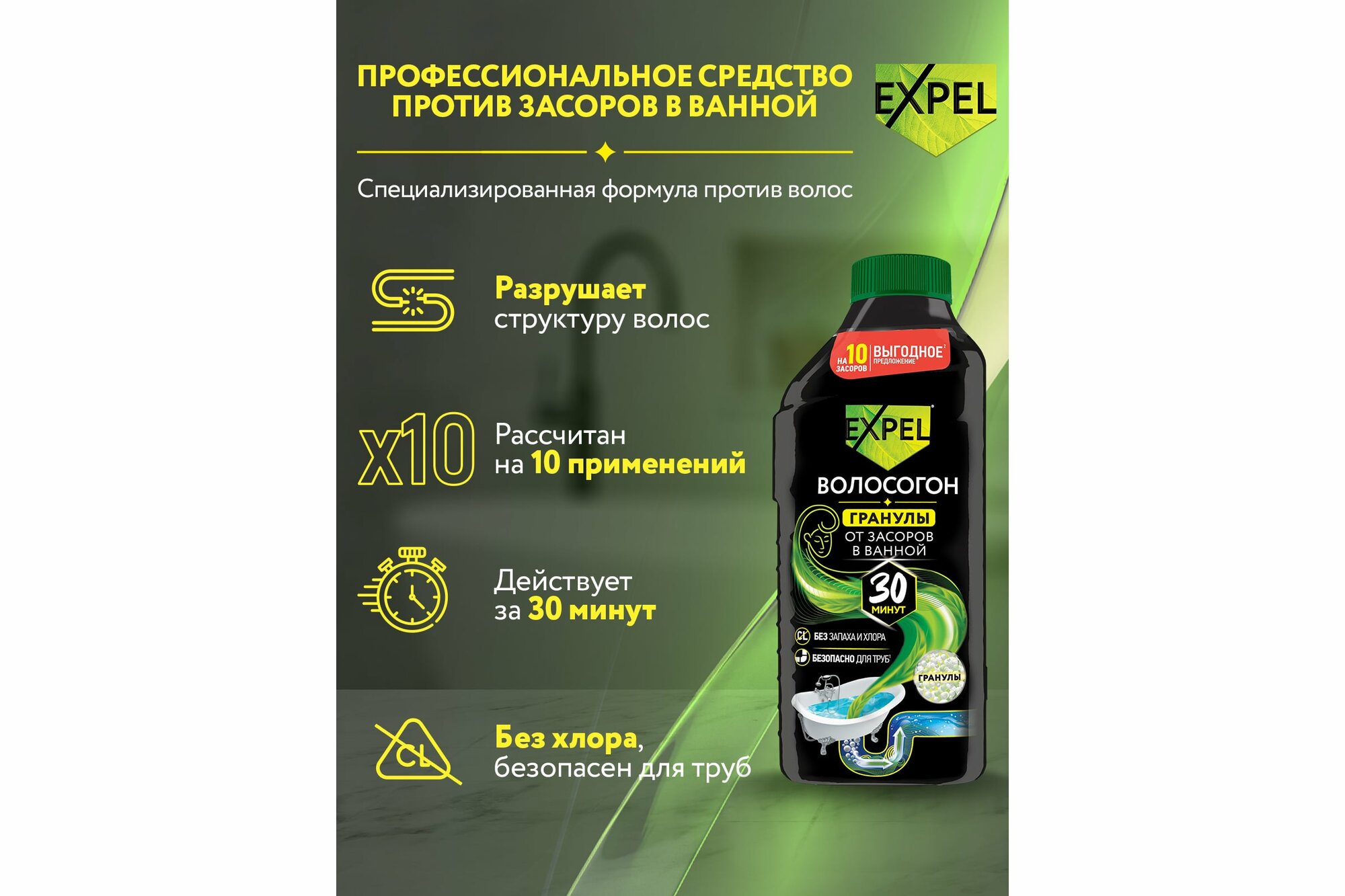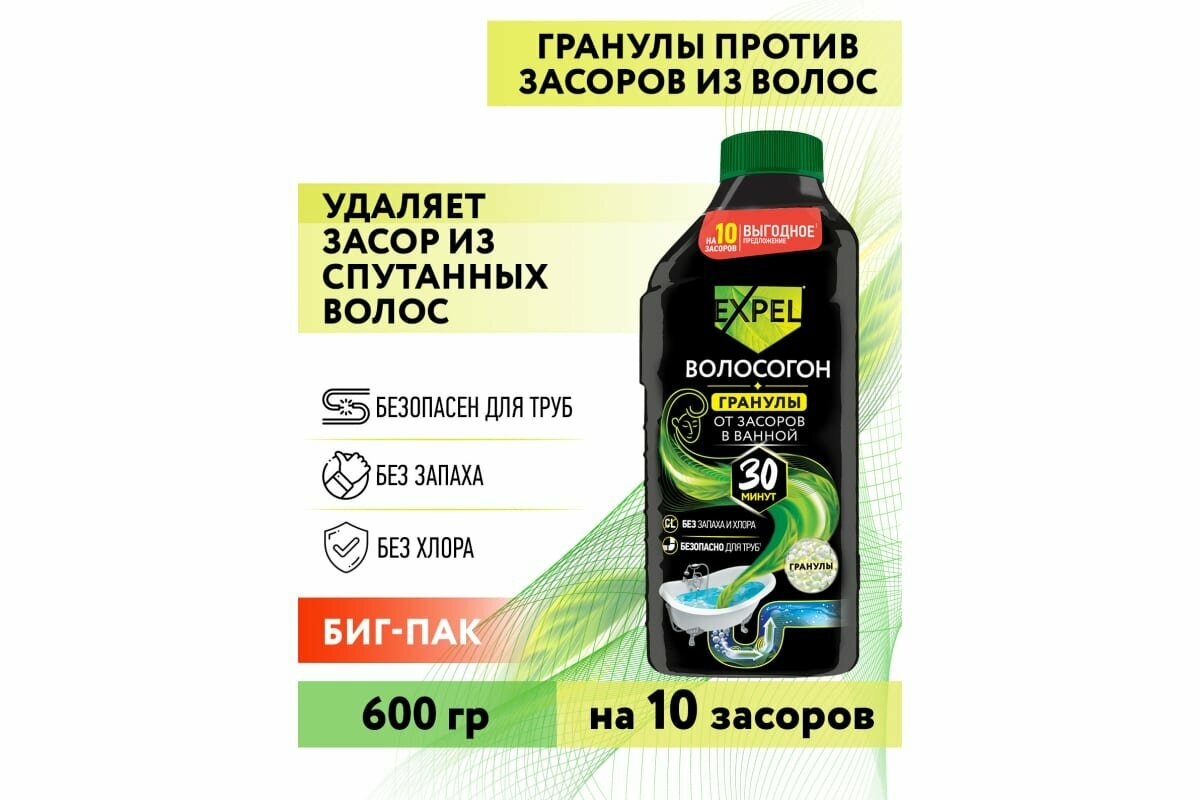 Средство для устранения засоров от волос в гранулах, Expel, волосогон, на 10 засоров, 600 г