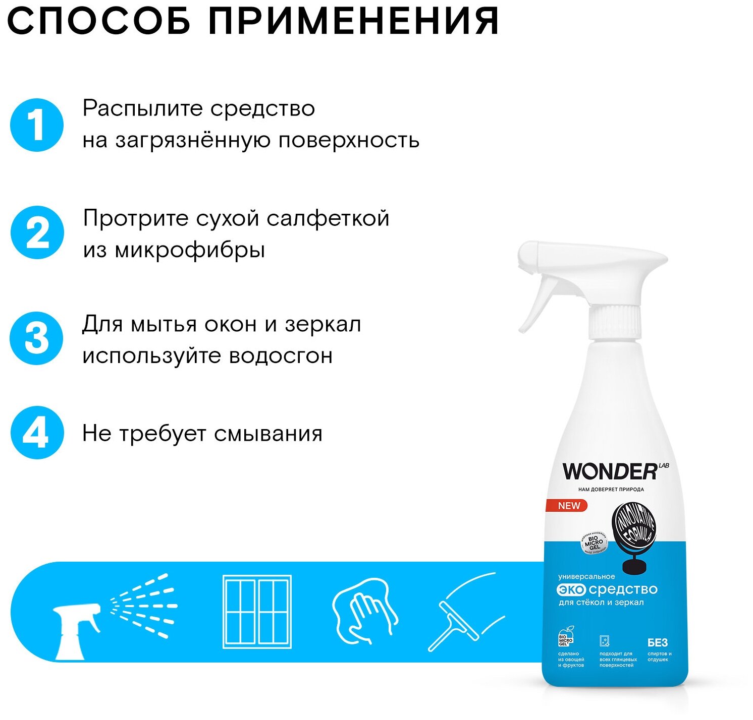 СохранитьЧистящее эко средство для окон стекол и зеркал WONDER LAB, спрей без спирта и запаха, 550 мл интересное: