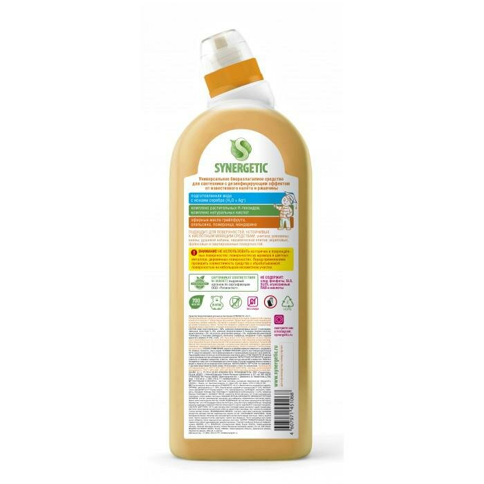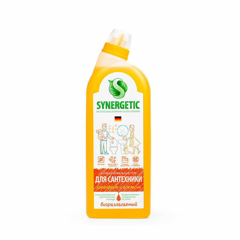 | Дополнительная информация | биоразлагаемое антибактериальное средство для сантехники SYNERGETIC "Грейпфрут и апельсин" - концентрированное чистящее средство для ежедневной уборки поверхностей, устойчивых к кислотным моющим средствам, в ванных комнатах и санузлах: унитаза, раковины, ванны, душевой кабины, керамической плитки, акриловых, фаянсовых и эмалированных поверхностей, средство с антибактериальным эффектом убивает микробы и бактерии, а также эффективно устраняет неприятные запахи, гипоаллергенная парфюмерная композиция с маслами грейпфрута, апельсина, померанца и мандарина оставляет свежий аромат, международный экологический сертификат ICEA подтверждает биоразлагаемость, безопасность и эффективность средства, средство полностью смывается водой, не содержит хлор, фосфаты, оптические отбеливатели, SLS, SLES, агрессивные кислоты и ПАВ, биоразлагаемые компоненты не вредят микрофлоре септических установок. |