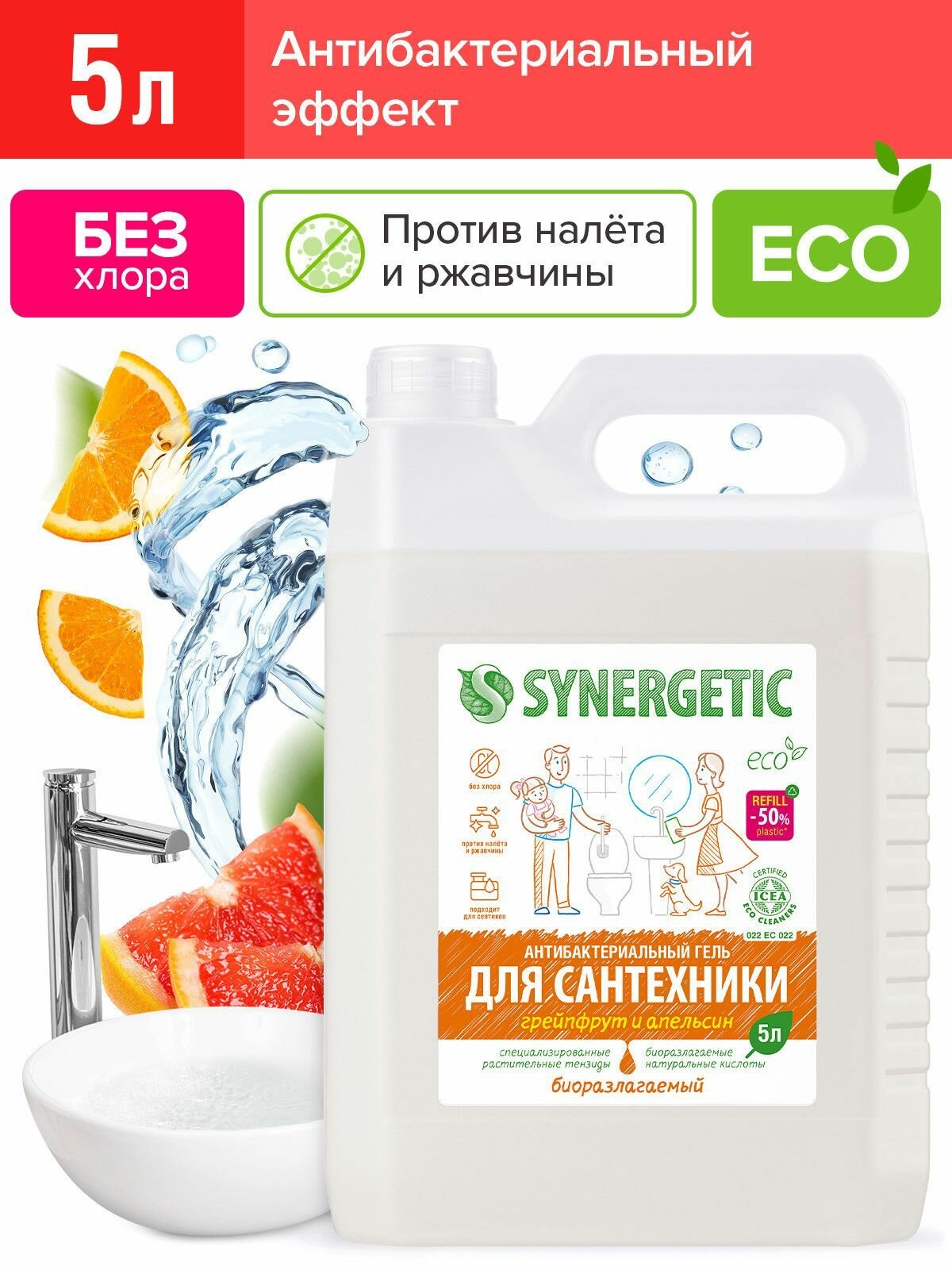 Купить SYNERGETIC "Грейпфрут и апельсин" чистящее средство, гель для ванной, сантехники, туалета, унитаза,антибактериальное, 5 л